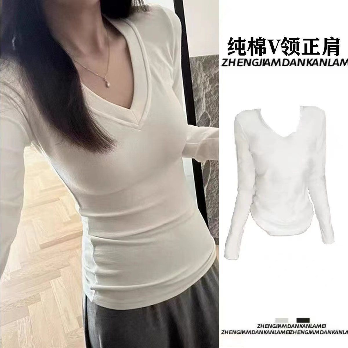 2025秋冬新款德绒V领正肩长袖t恤女内搭打底衫修身基础款辣妹上衣