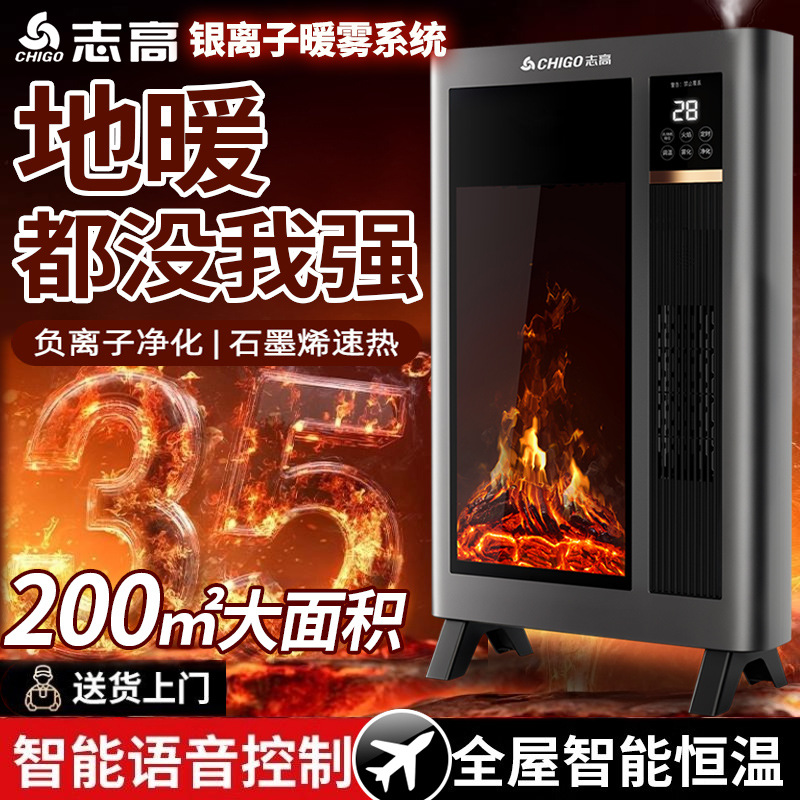 志高石墨烯取暖器仿真炭火+智能语音+加湿家用暖风机壁炉热风机