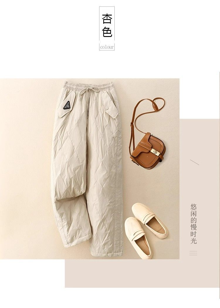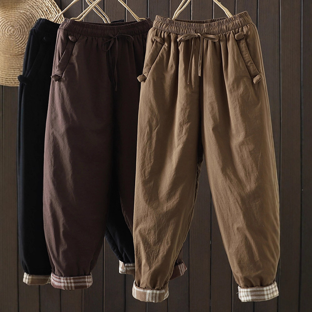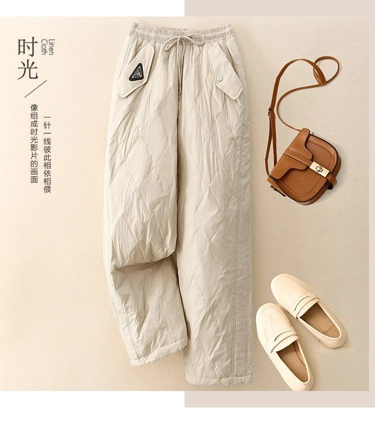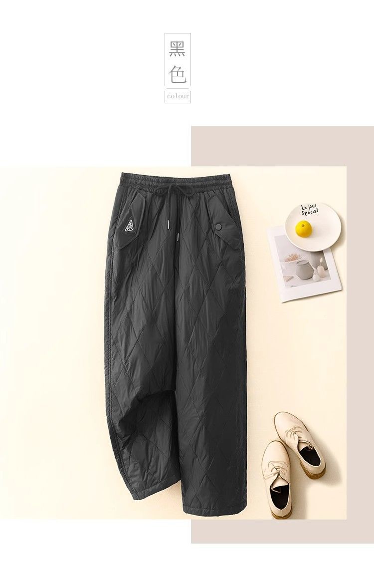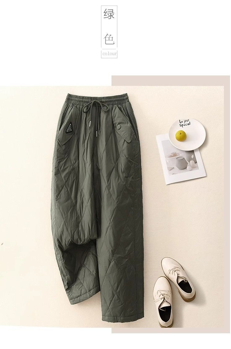 2025冬の新作文学レトロ無地菱形ダウンコットンパンツ、防風性と保温性に優れた厚みのあるゆったりとした女性用カジュアルパンツ