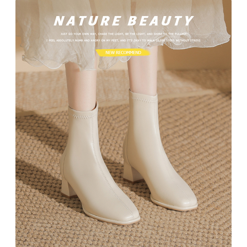 7cm サイズ 31-40 スクエアトゥ 太ヒール ミッドカーフブーツ スリムマーティンブーツ 身長アップ ハイヒール バックジッパー ショートブーツ 女性用