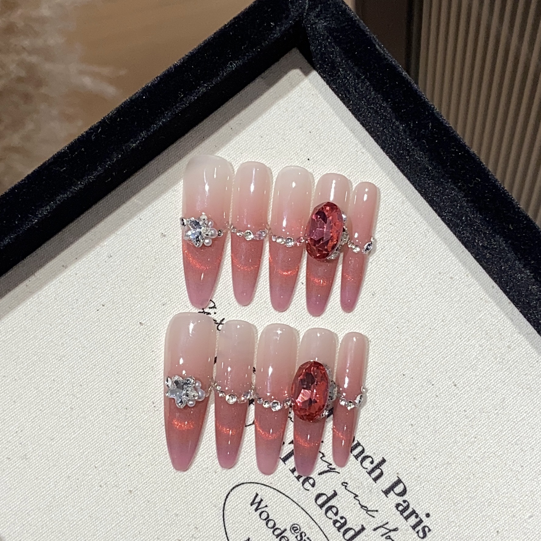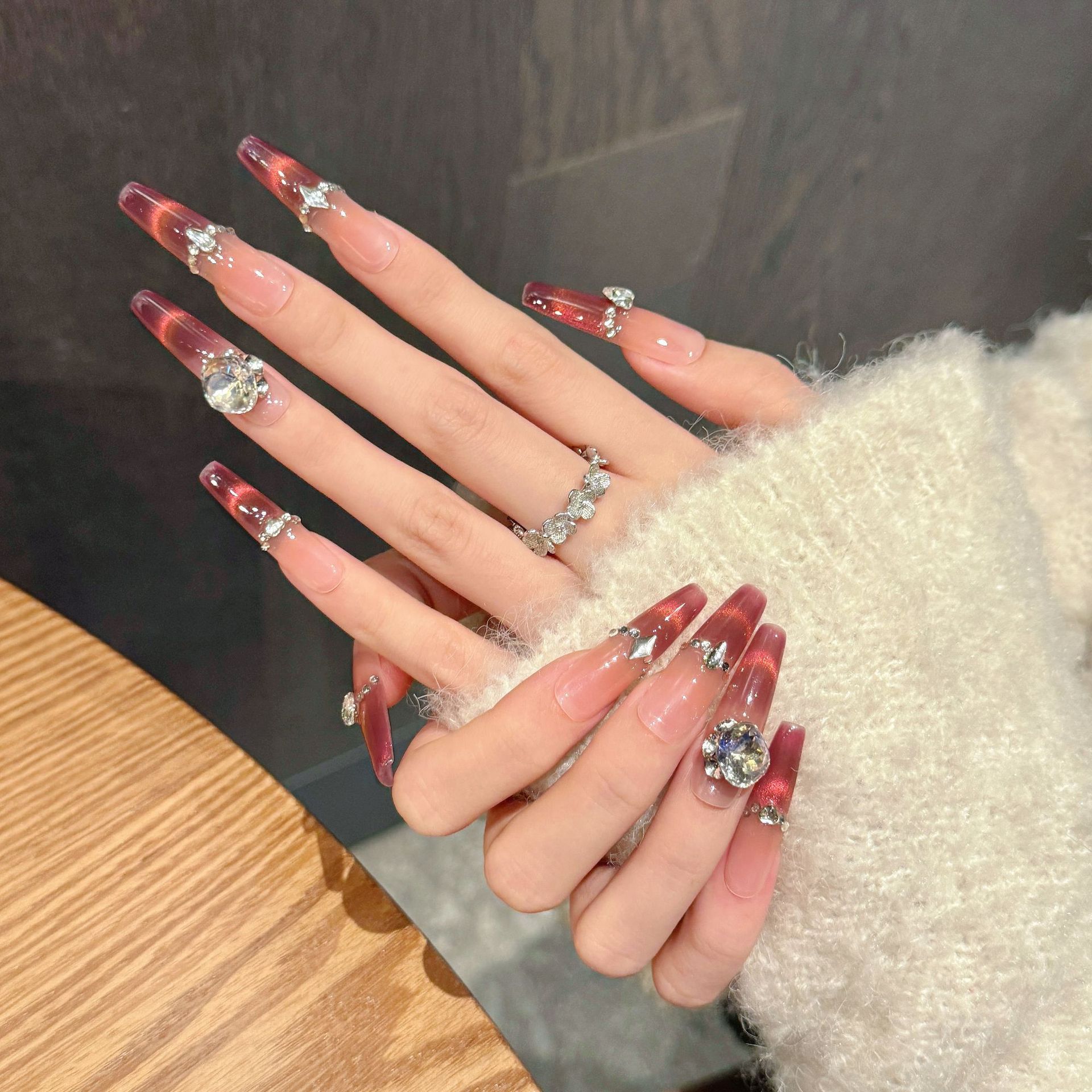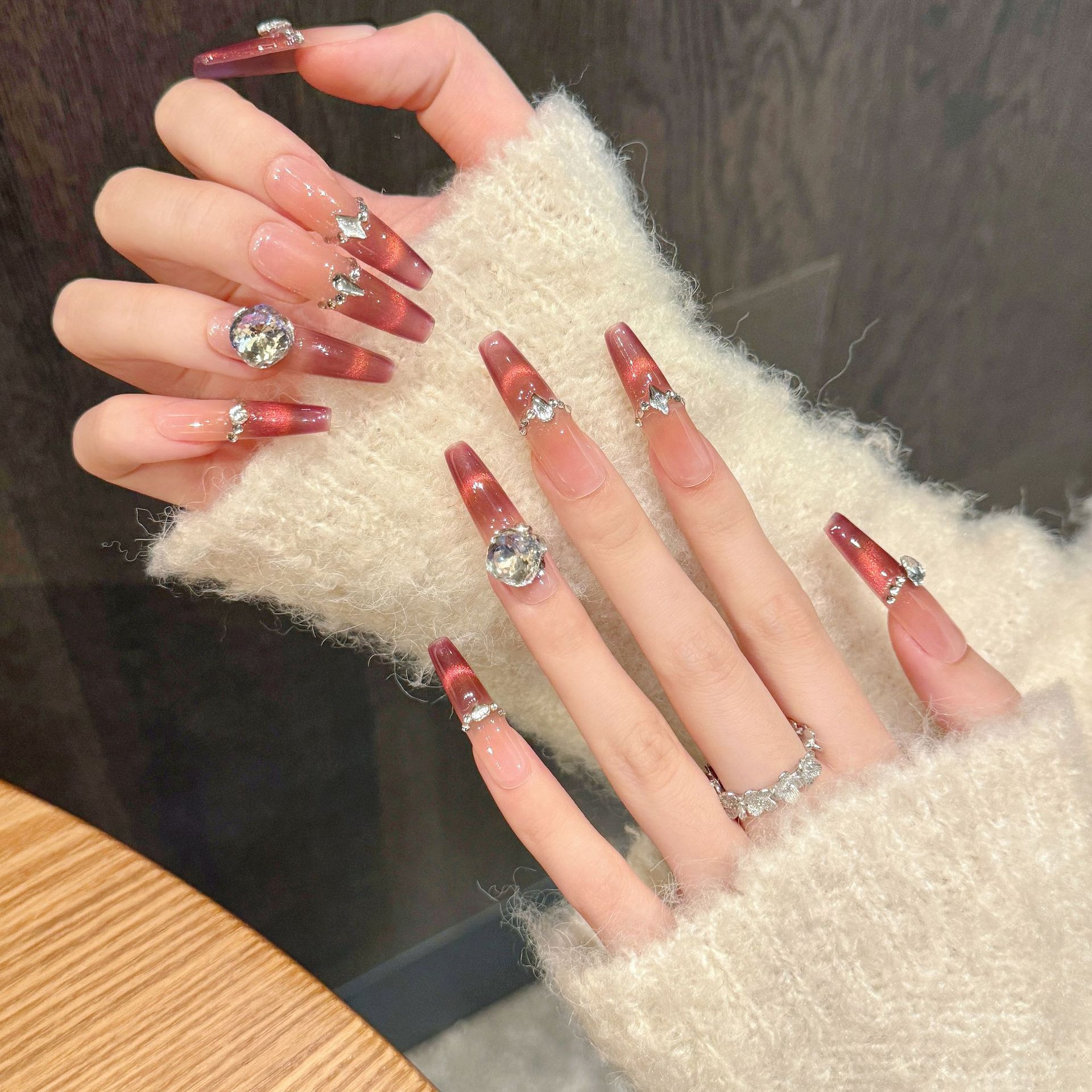 艺禾原创【玫钻柔韵】酒红粉裸撞色闪钻温柔气质款简约手工穿戴甲