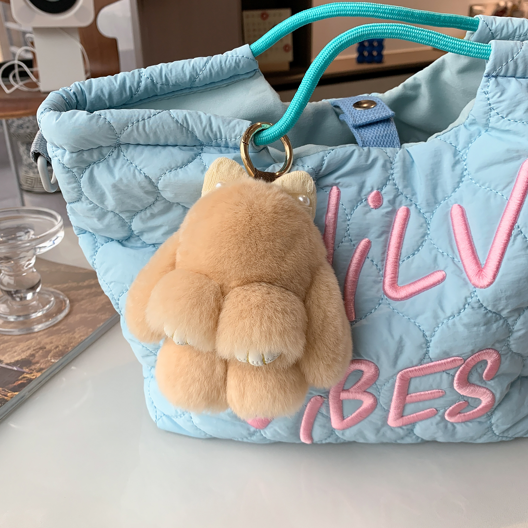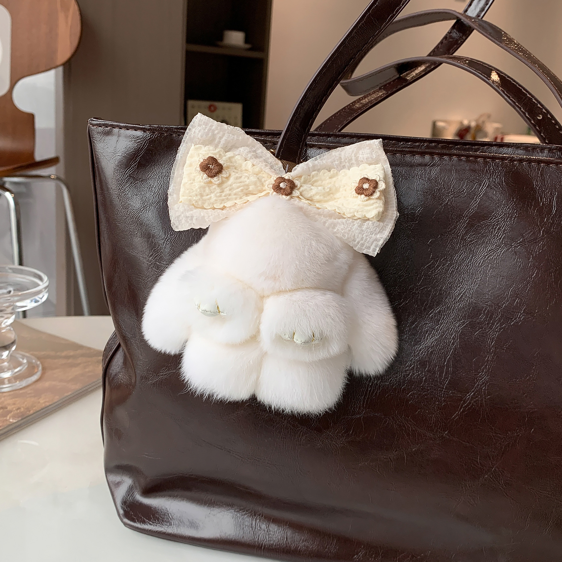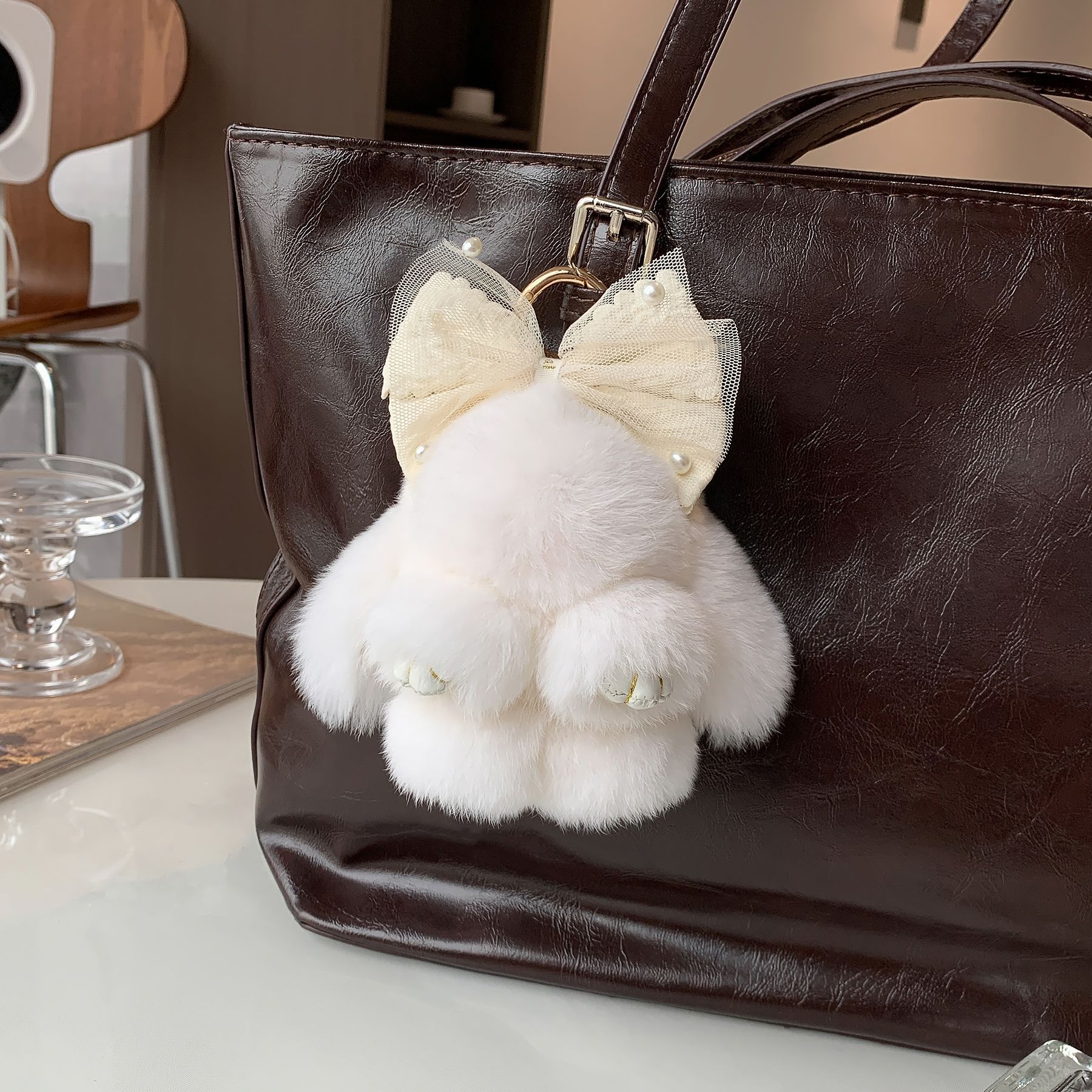 【かわいいヒグマ】本物のウサギの毛バッグにぬいぐるみの人形の車のキーホルダーの誕生日プレゼント