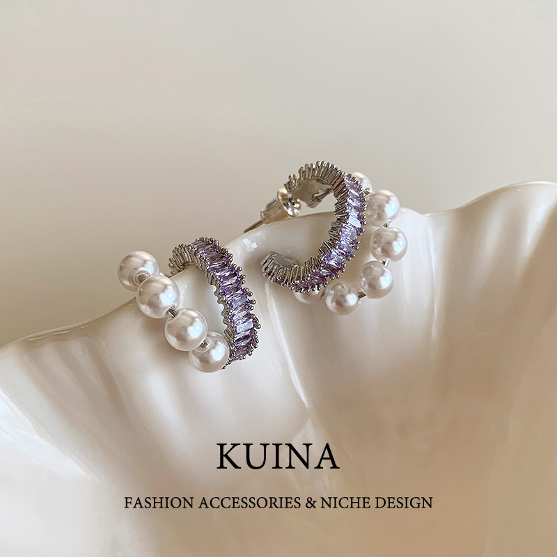 パープルジルコンパールイヤリング、高級イヤリング、絶妙で軽い高級感、ユニークなシルバーニードルイヤリング、四角顔と丸顔のイヤリング