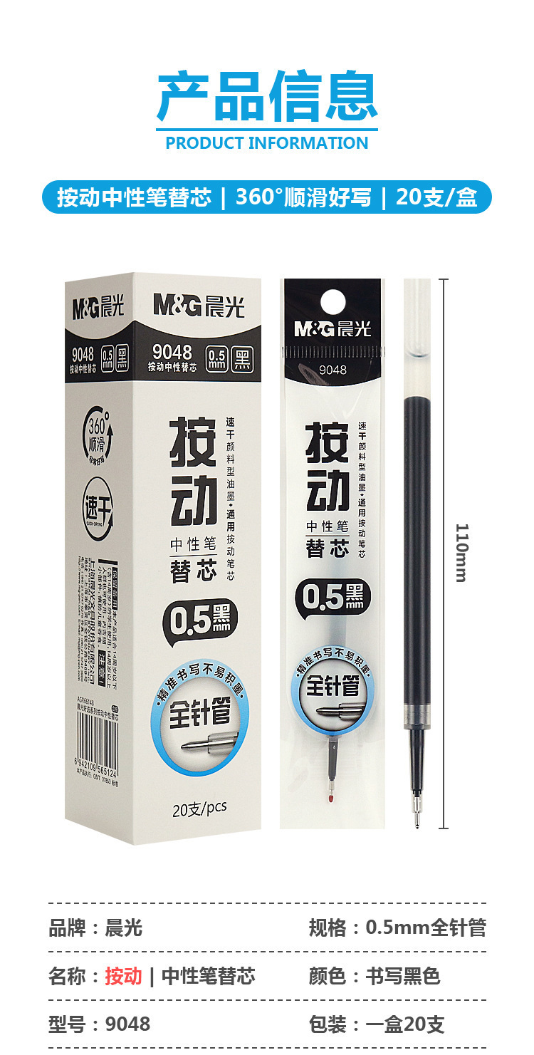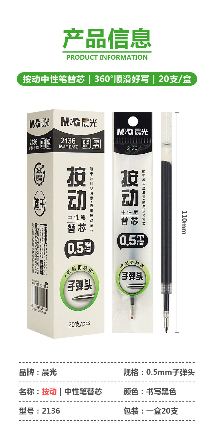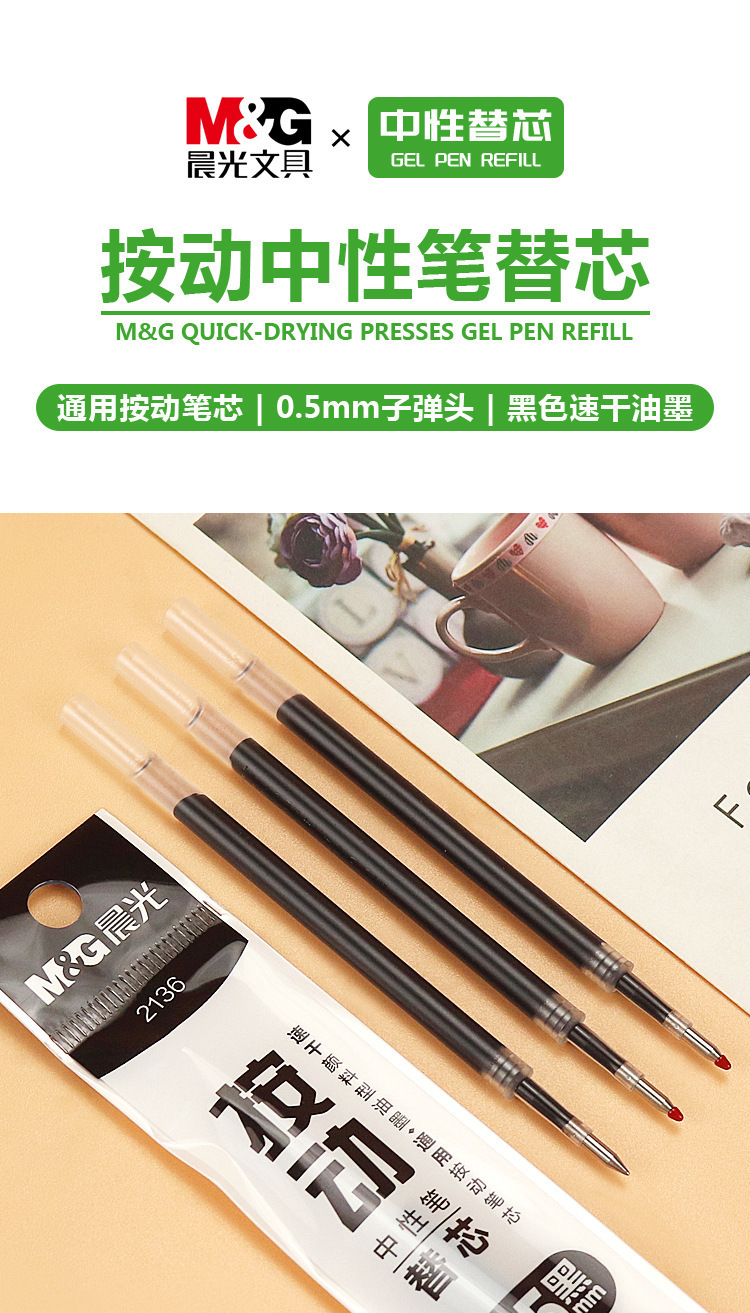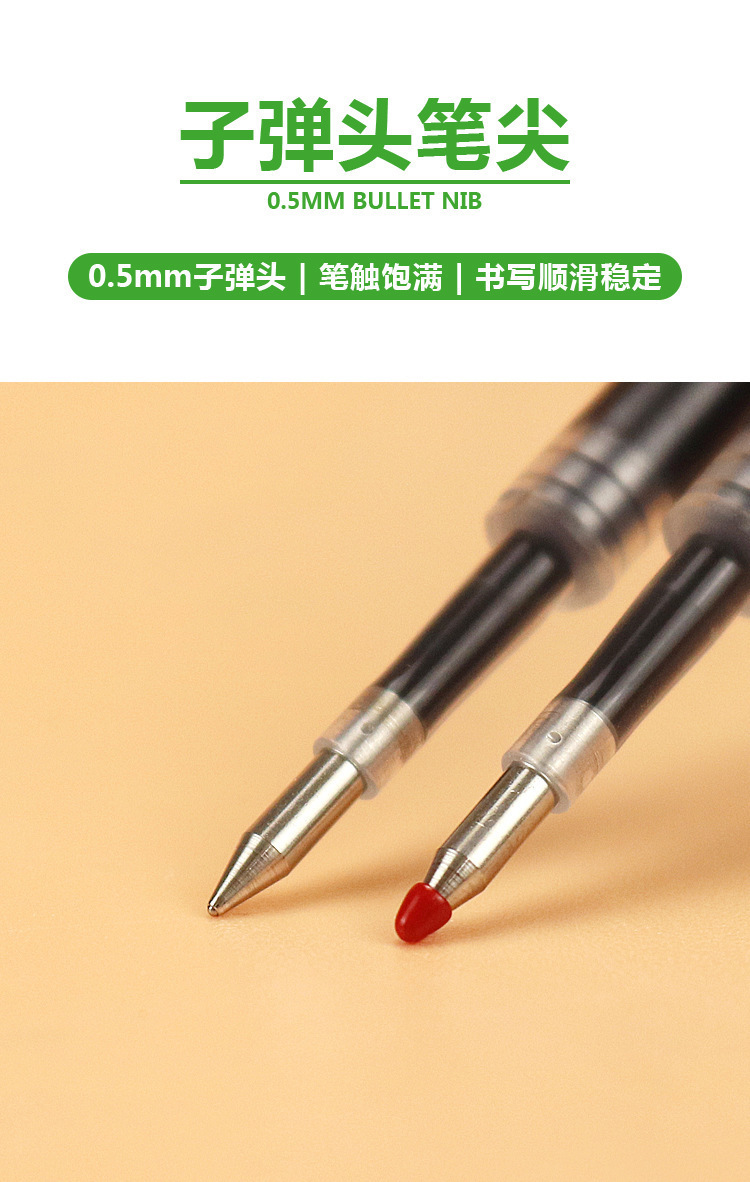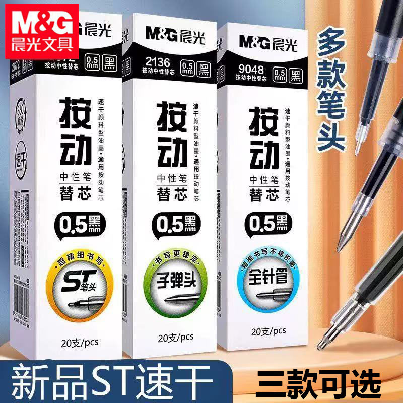 晨光通用按动笔芯子弹头0.5黑色中性替芯ST速干全针管水笔芯2136