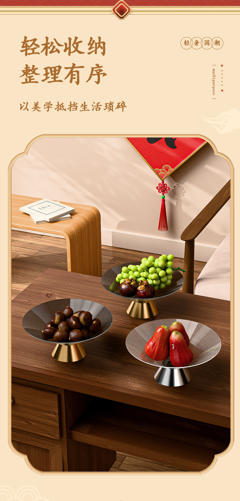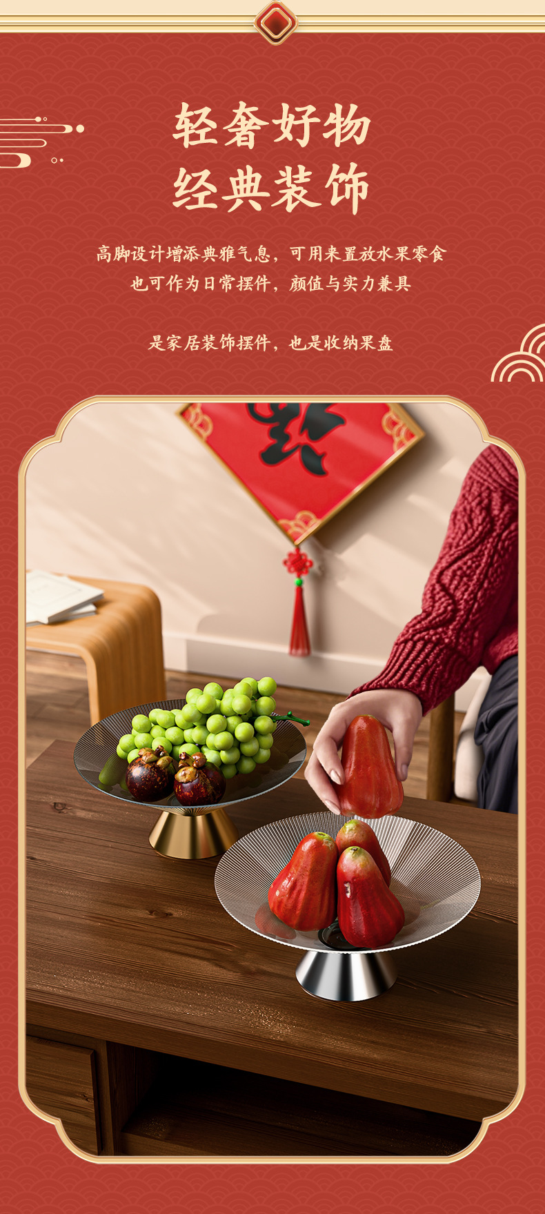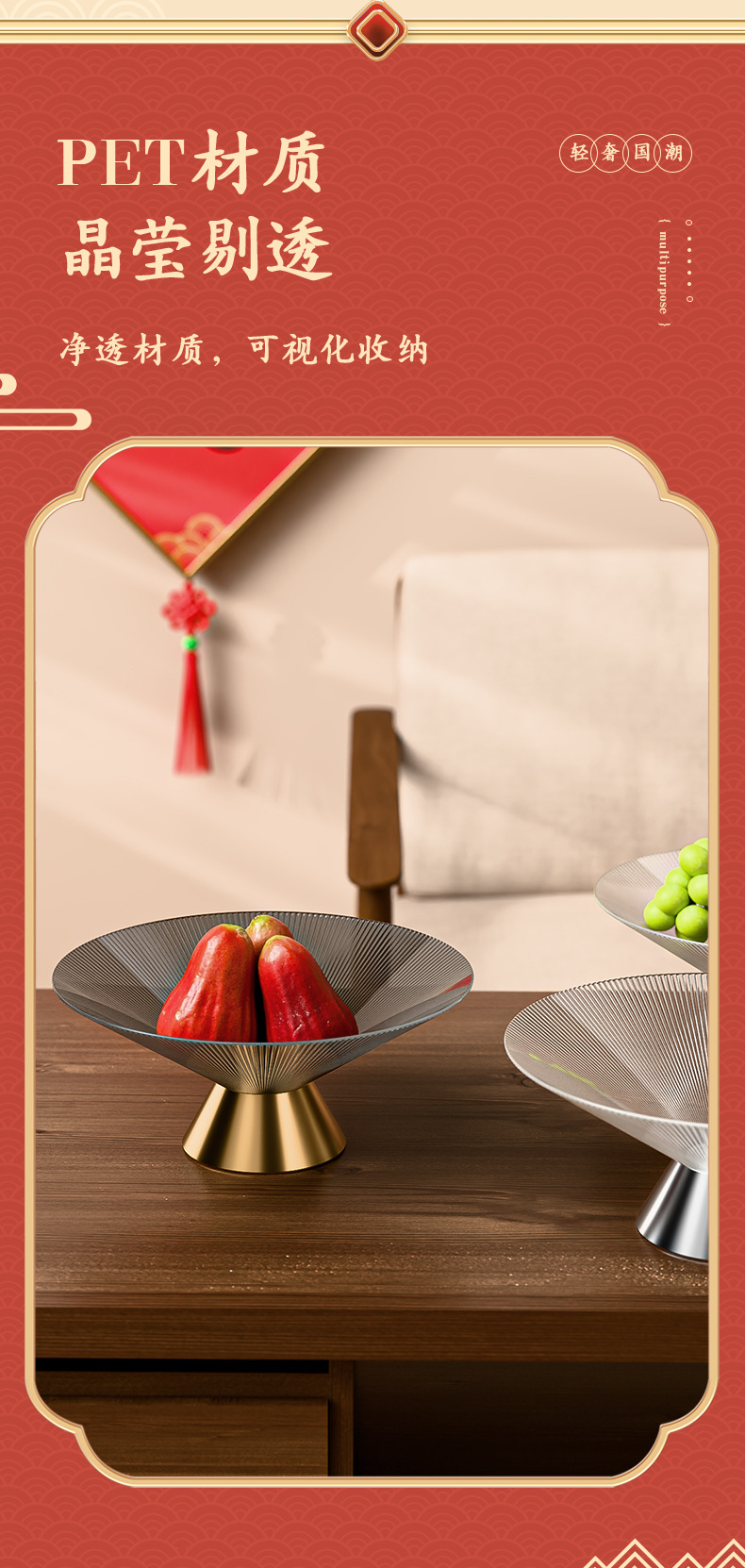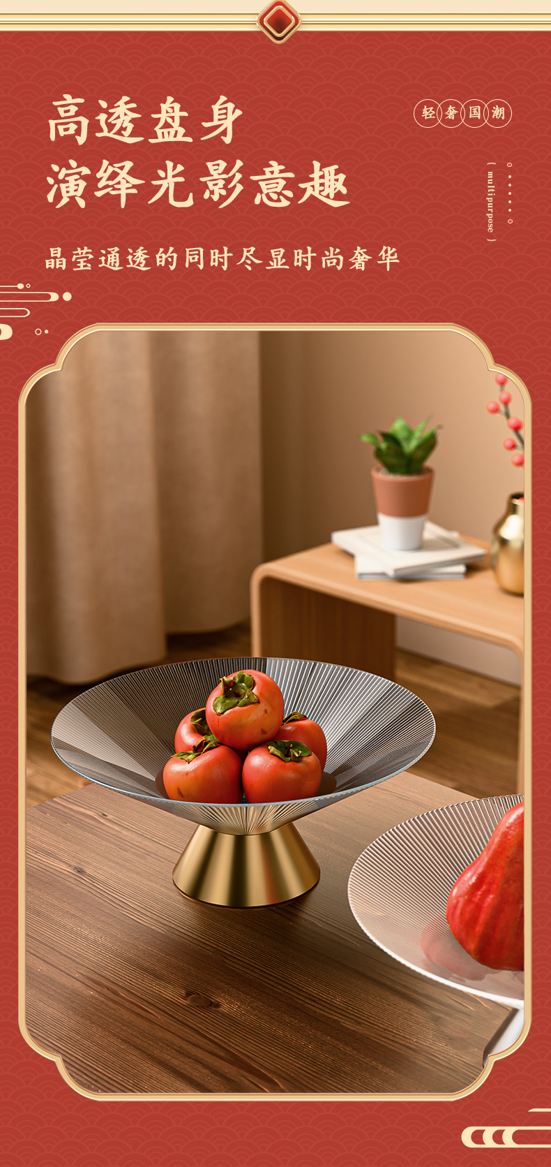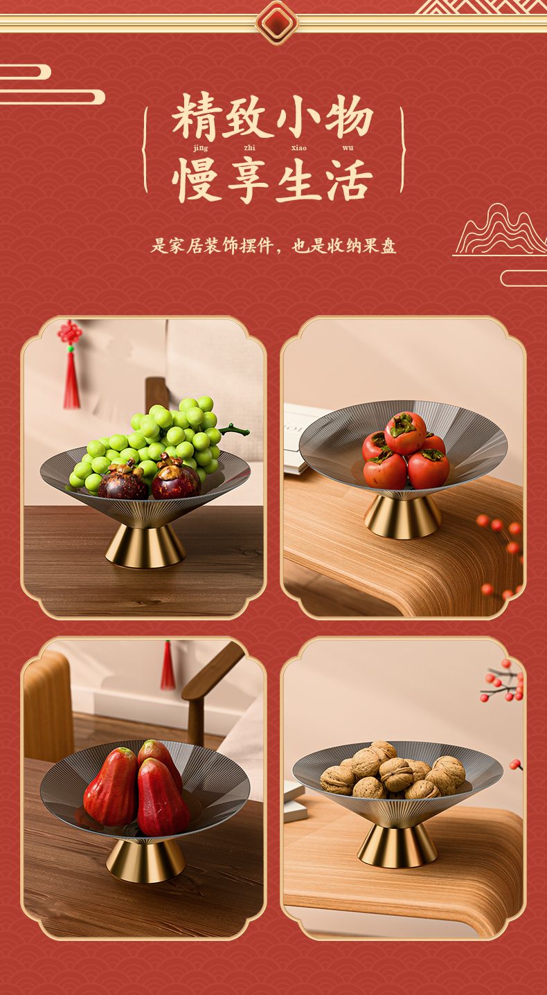 新中式高脚玻璃水果盘感家用客厅茶几摆件大容量干果盒糖果盘