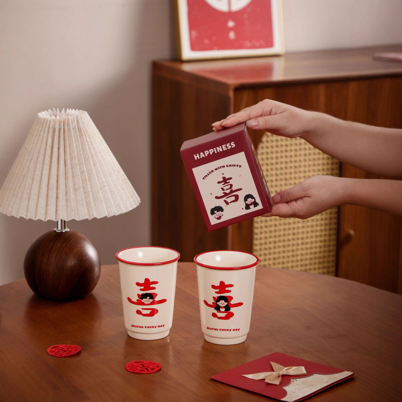 中式喜字陶瓷马克杯儿童早餐杯喝水杯情侣杯牛奶咖啡杯婚礼伴手礼