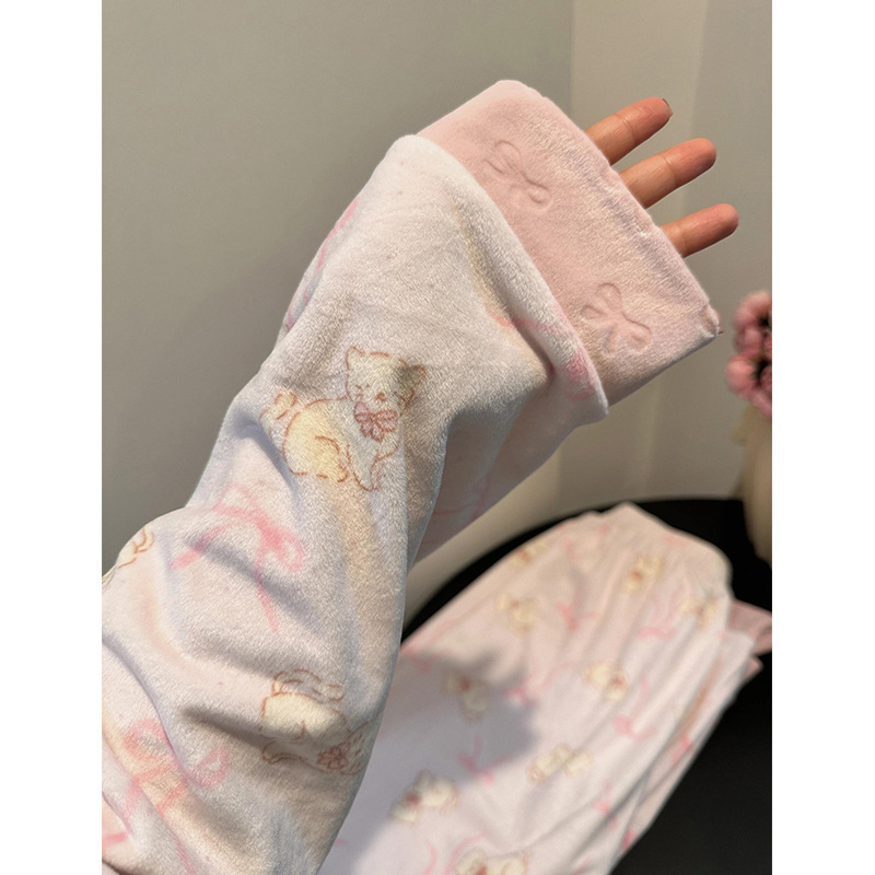 甜美少女可爱猫咪印花海岛绒睡衣女冬新款保暖加厚舒适家居服套装