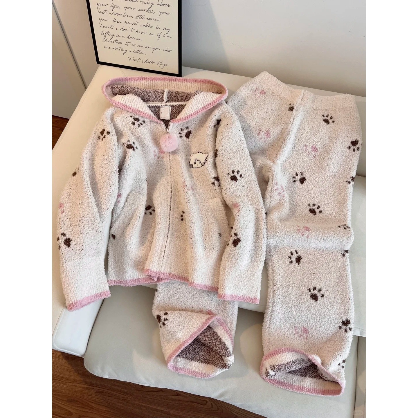韩系连帽猫爪玛丽猫针织半边绒睡衣女秋冬新款保暖加厚家居服套装