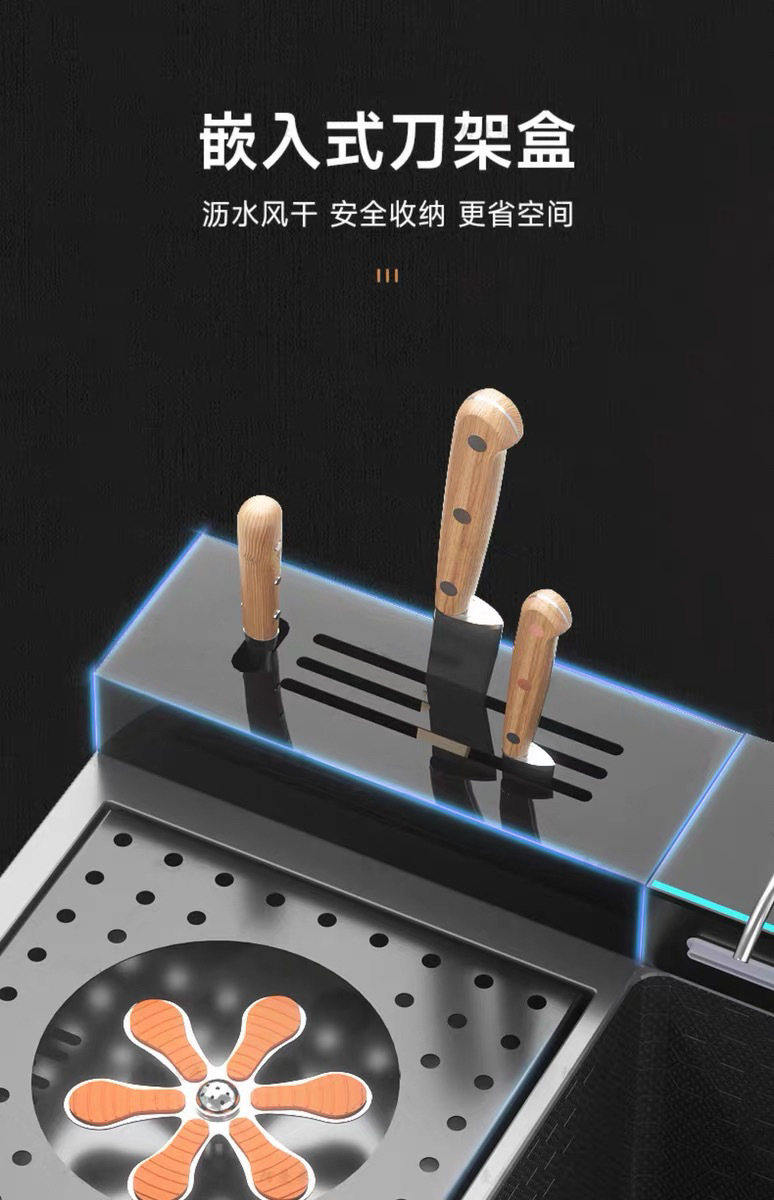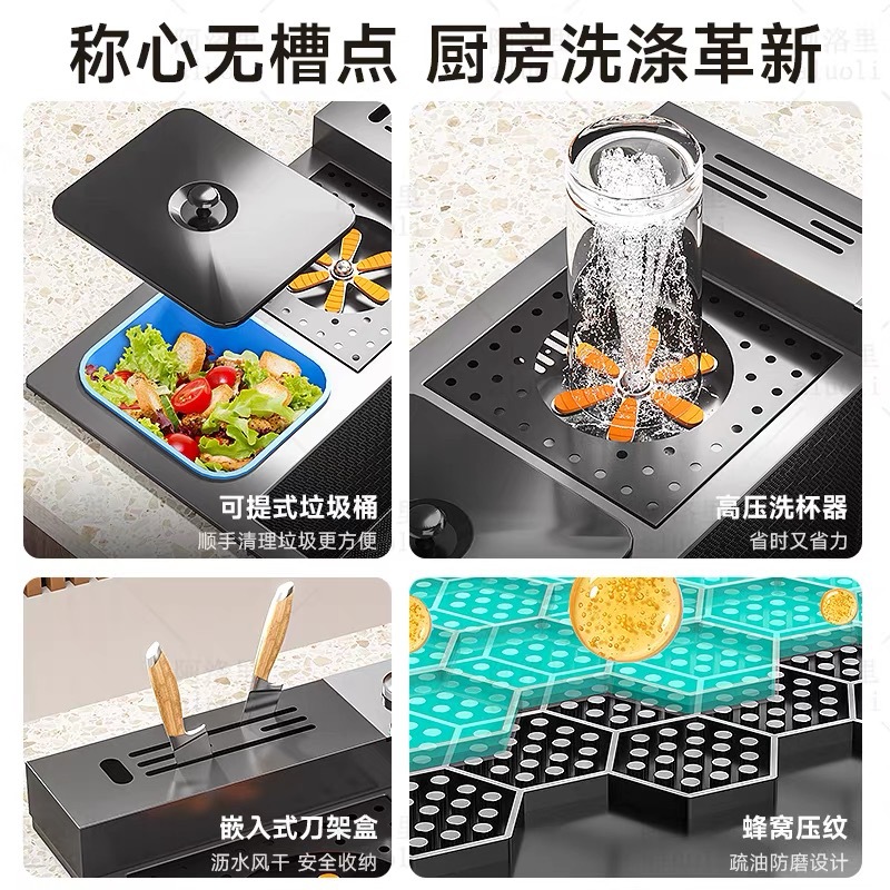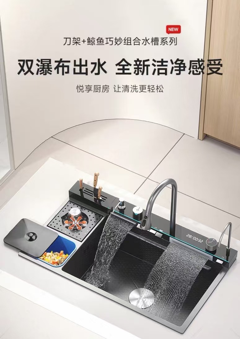 鲸鱼瀑布多功能水槽蜂窝压纹304不锈钢厨房大单槽洗菜盆洗碗池