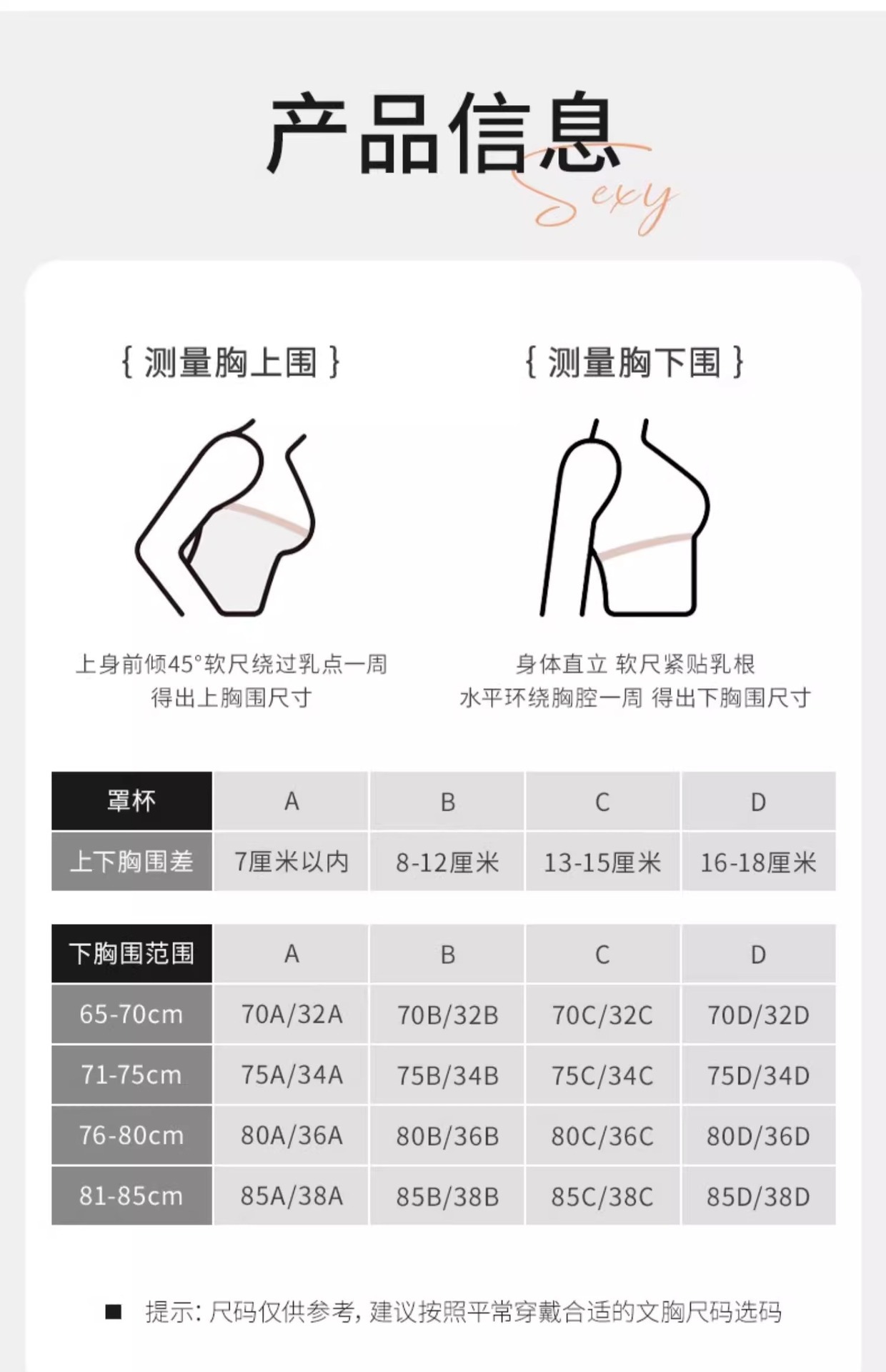サイズ S (32/70ABに適しています),M (34/75ABに適しています),L (36/80ABに適しています),XL (38/85ABに適しています)