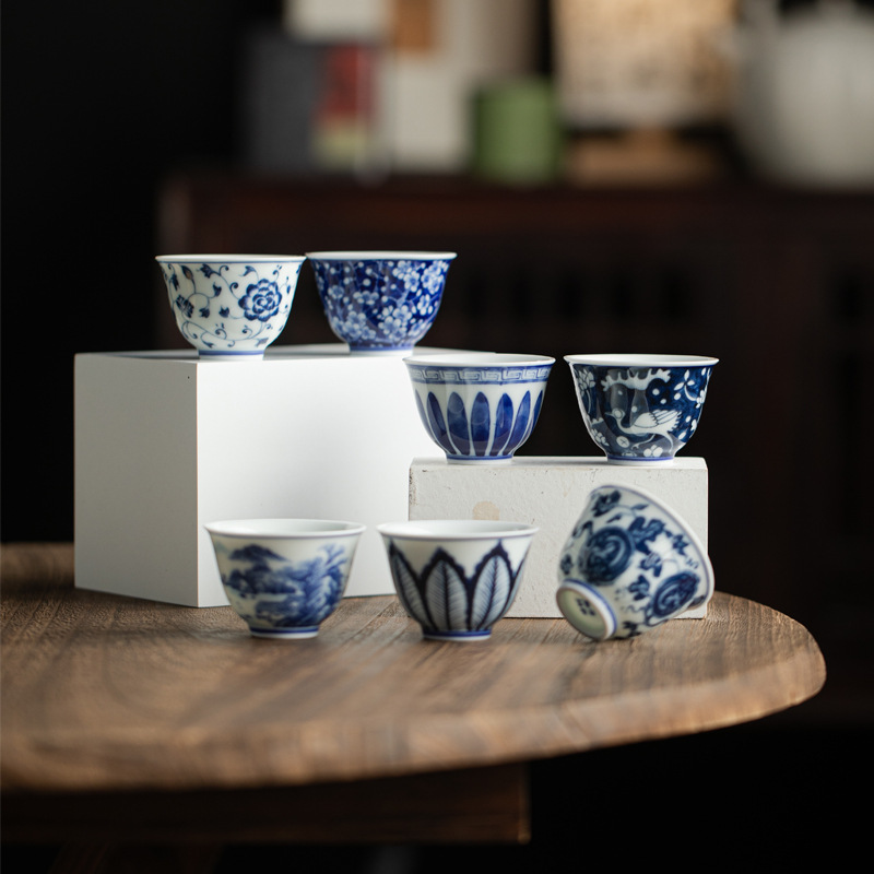 中国式青花手描き品茗杯工夫茶器釉薬下彩陶磁器カップ家庭用闘笠カップ35ml客カップ