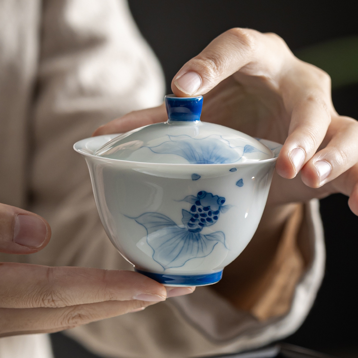手描き水墨錦鯉三才蓋碗釉薬下精工手作金魚泡茶碗清新漁趣手掴み碗