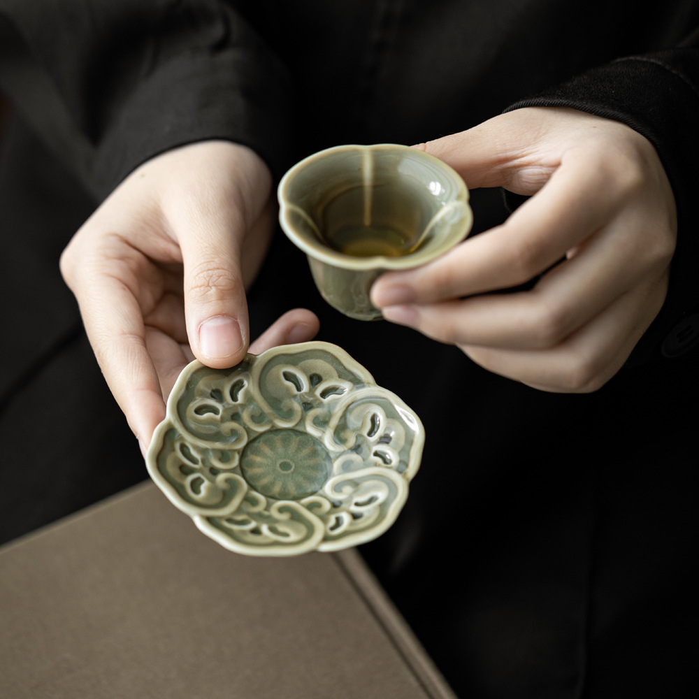 泥人叙越窯青磁レリーフ高足杯マット隠れ彫刻蓮花祥雲茶托茶器部品茶碗蓋置