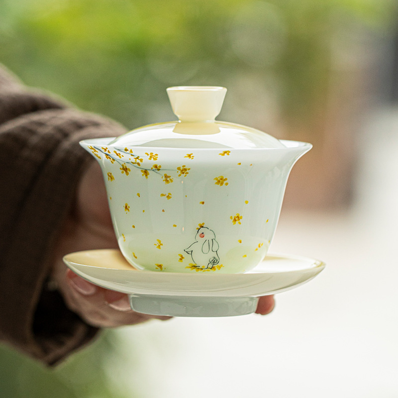吊り下げ可能な氷翡翠磁器手描き翡翠ウサギ秦シナモン三彩ボウル釉下色グラデーションウサギキンモクセイ茶ボウル