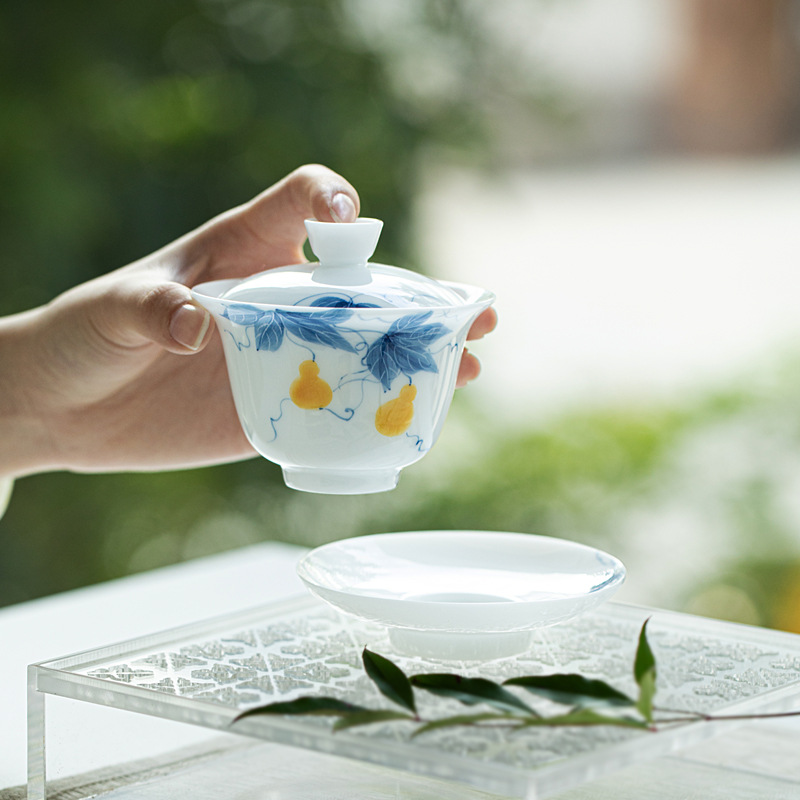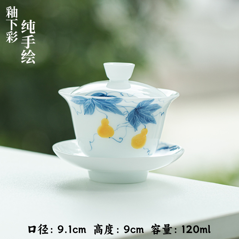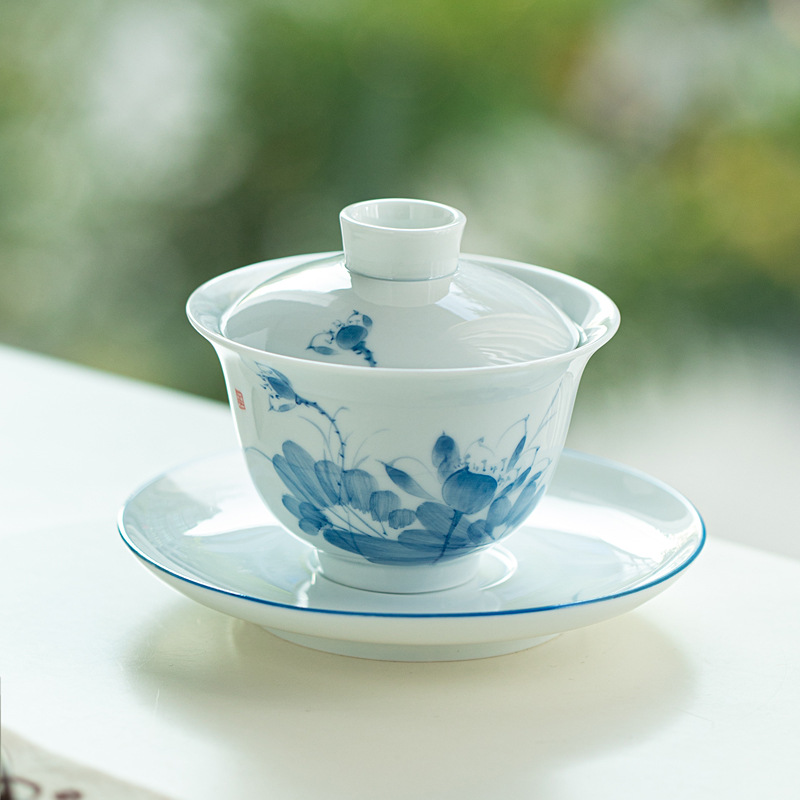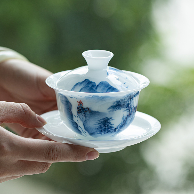氷種玉磁器手描き青花山水三才蓋碗釉薬下彩高白磁茶碗プレゼント