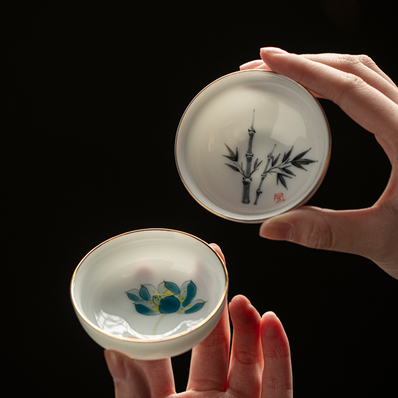 蜜黄釉手描き陶磁器カップ釉薬下彩手作りハスの花竹蘭漁趣味品茗杯家庭用聚香杯