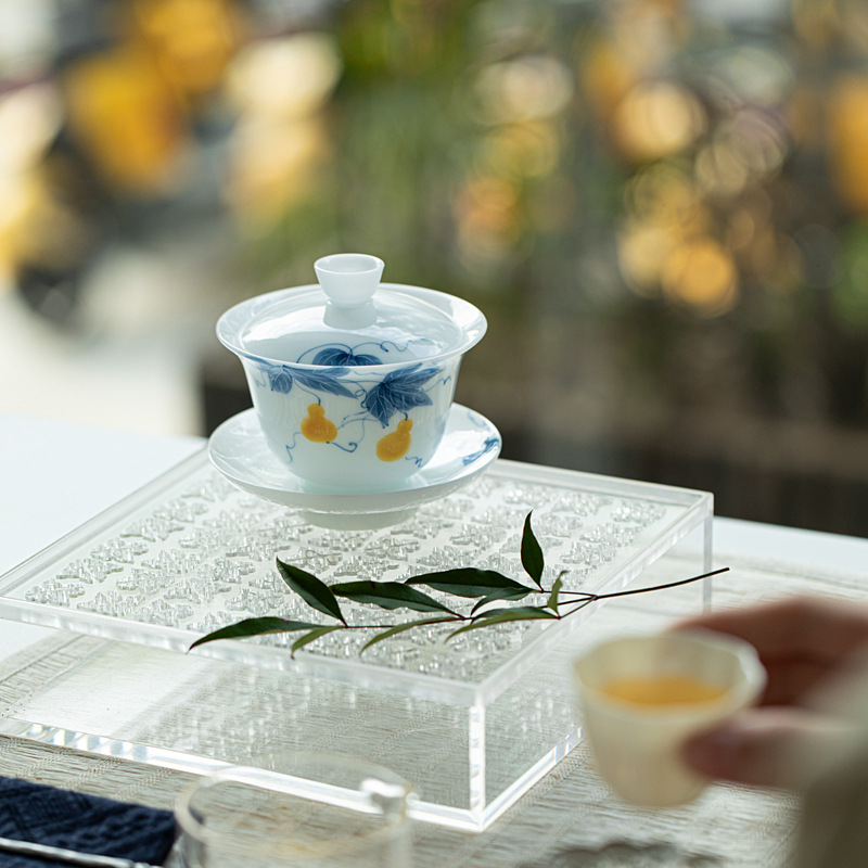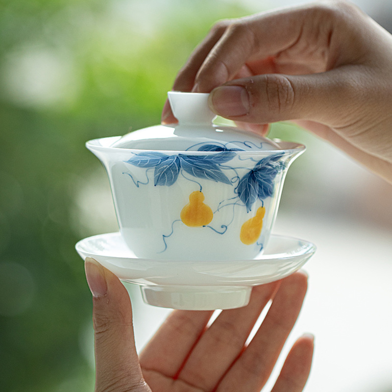 氷玉磁手描き藤花三才蓋碗 釉下彩功夫茶器 高白磁 家庭用女性用茶碗