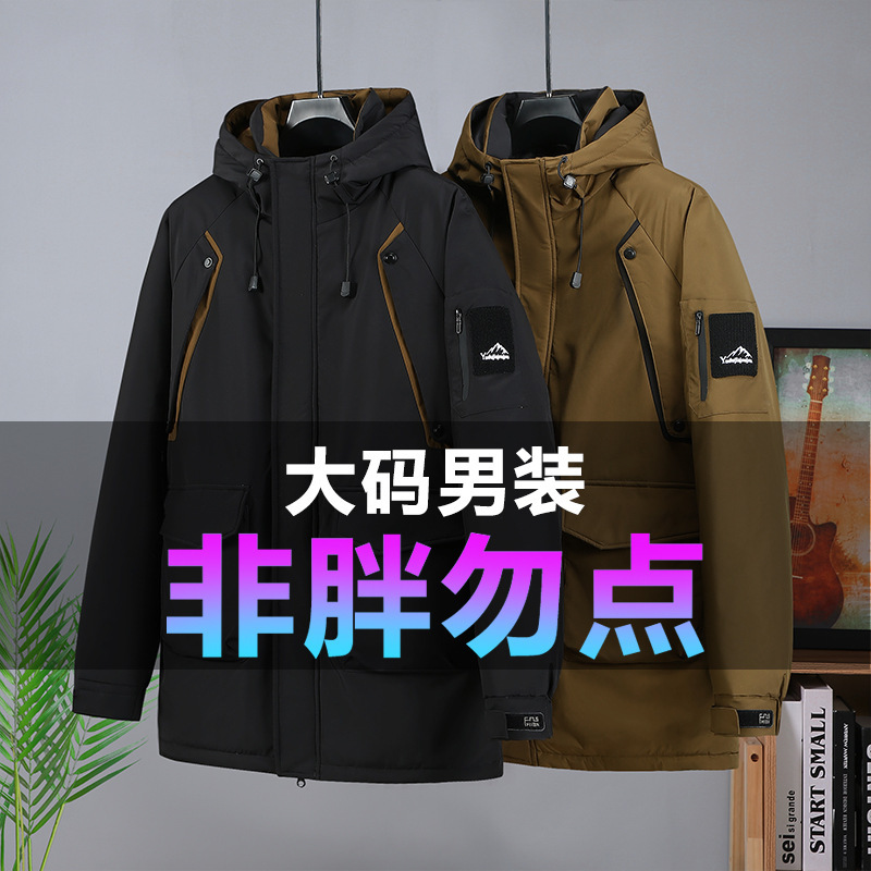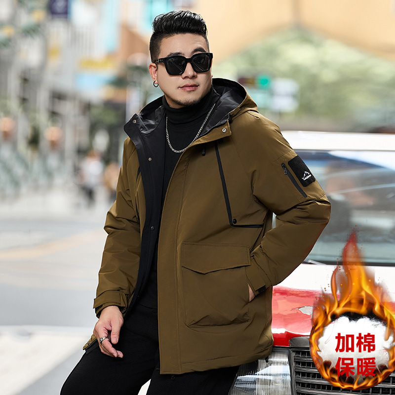2025冬の特大サイズの日系工装と帽子の綿入れの男のデブの中の長いタイプのファッションブランドのカジュアルな保温綿入れの上着