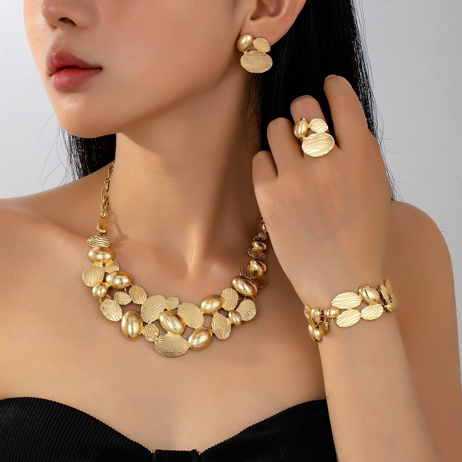 跨境希音轻奢艺术金色复古肌理与几何造型融合手饰耳环项链套装女
