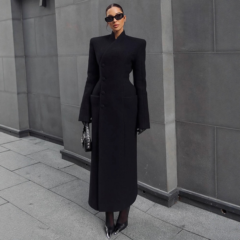 时尚气质高级感收腰纯色立领长款毛呢大衣2025秋冬新款跨境欧美风