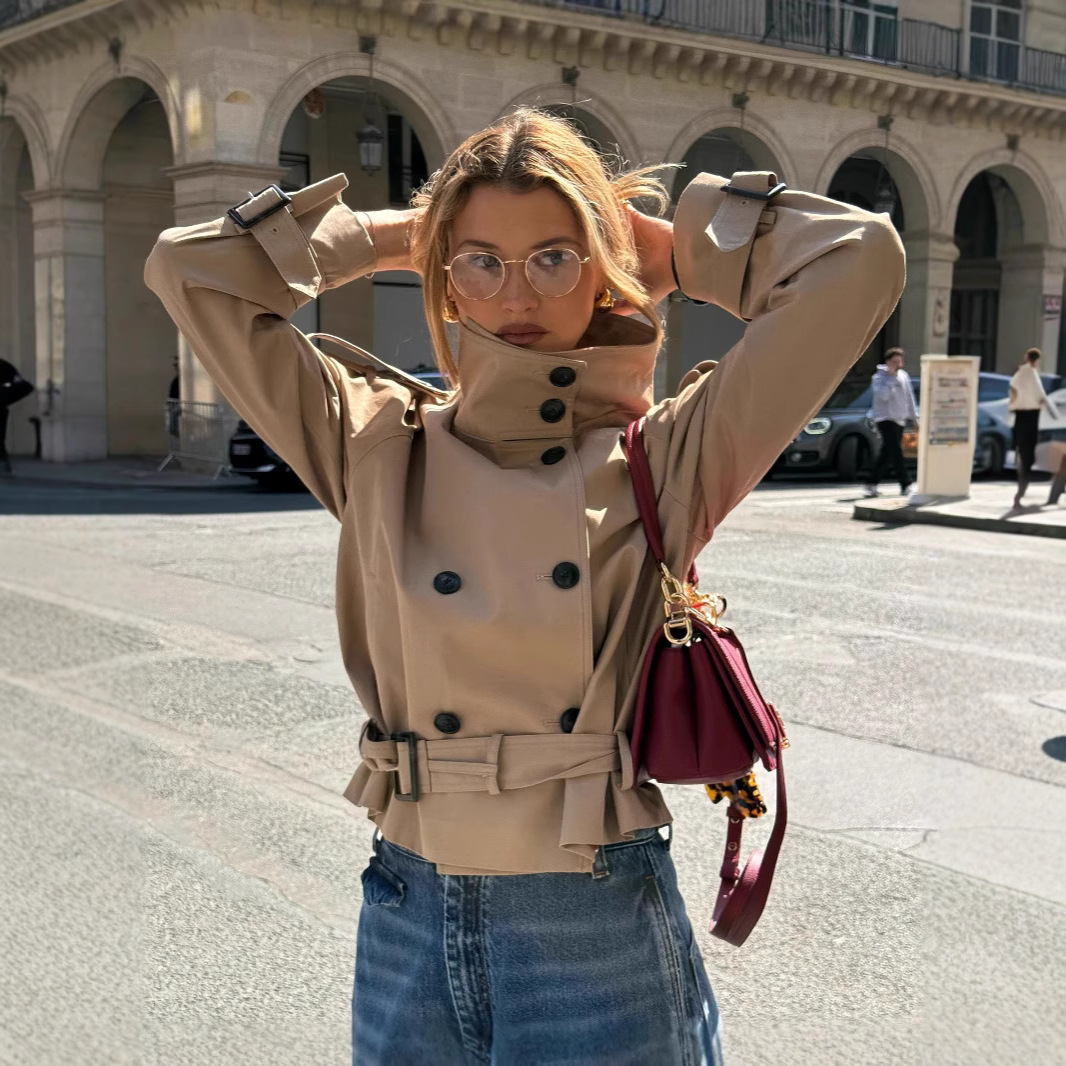 カーキベルト付きショートダブルブレストウインドブレーカージャケットヨーロッパとアメリカのクロスボーダー2025春ファッションジャケット