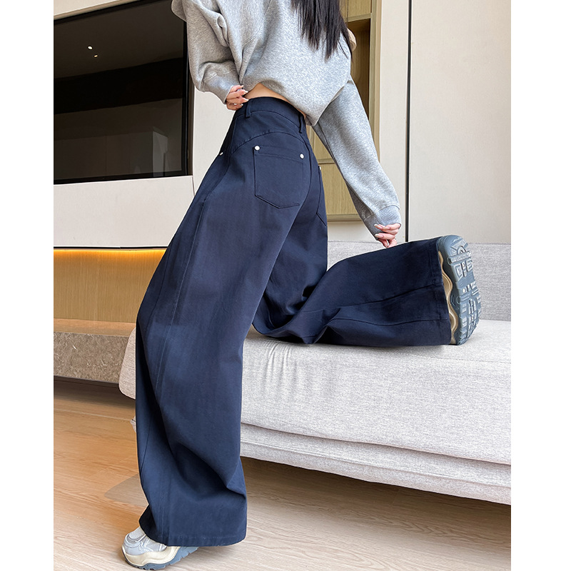 藏青色弯刀裤女2025新款春秋高腰宽松阔腿裤休闲裤显瘦美式牛仔裤