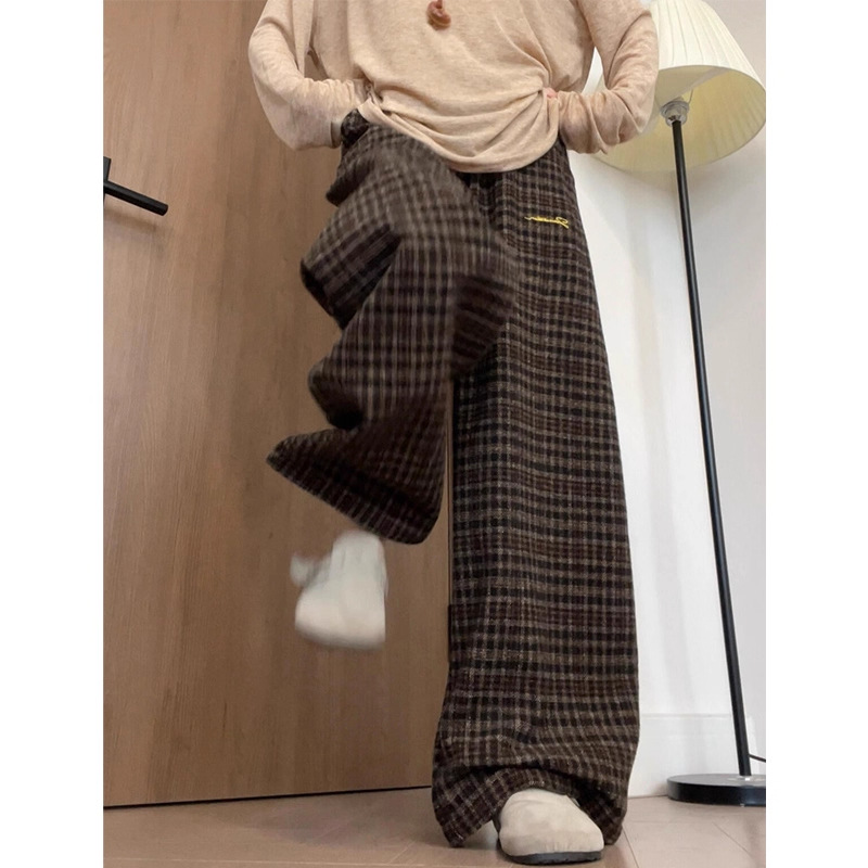 黑灰色加厚羊羔绒毛呢格子裤女秋冬季直筒垂感宽松显瘦慵懒阔腿裤