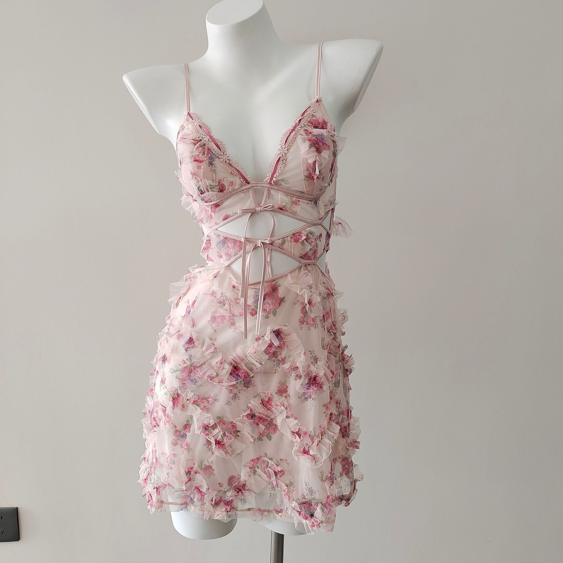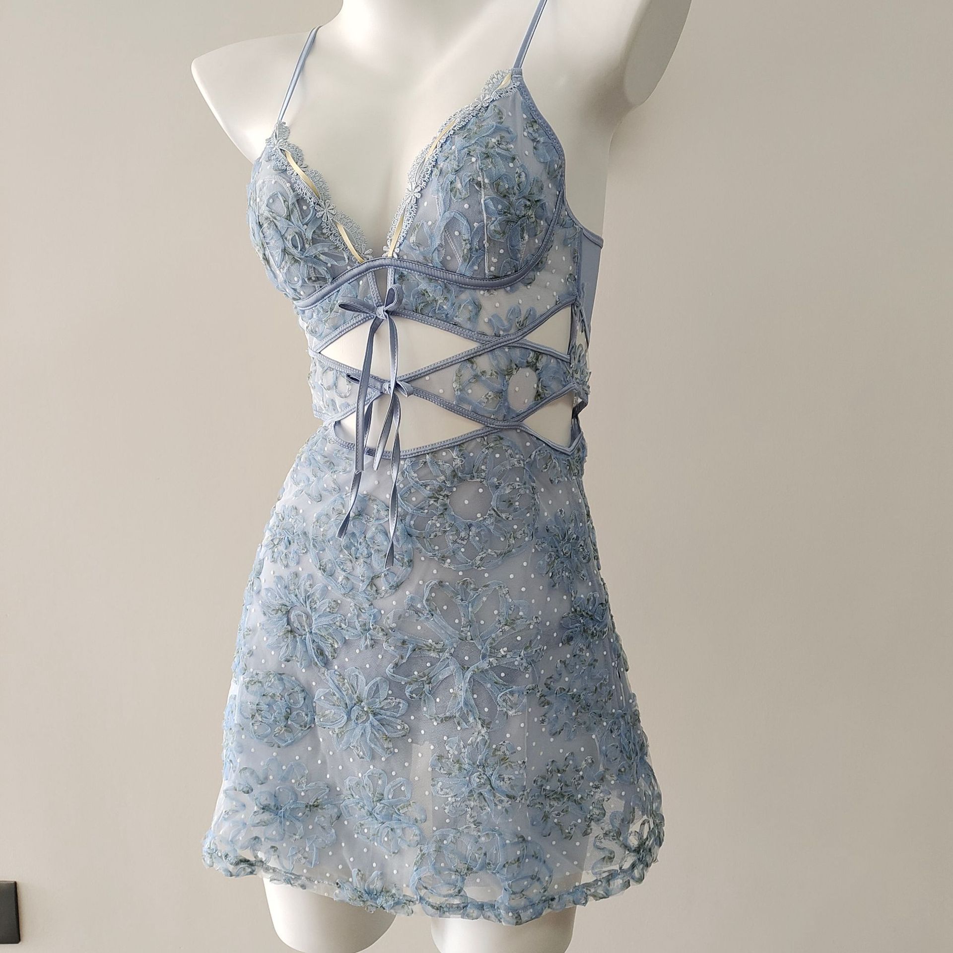 フランスのロマンチックな軽薄な透視の花のレースのセクシーなガーターの睡眠のスカートの純粋な欲の高級感はやせている高いフォークのパジャマを現します。