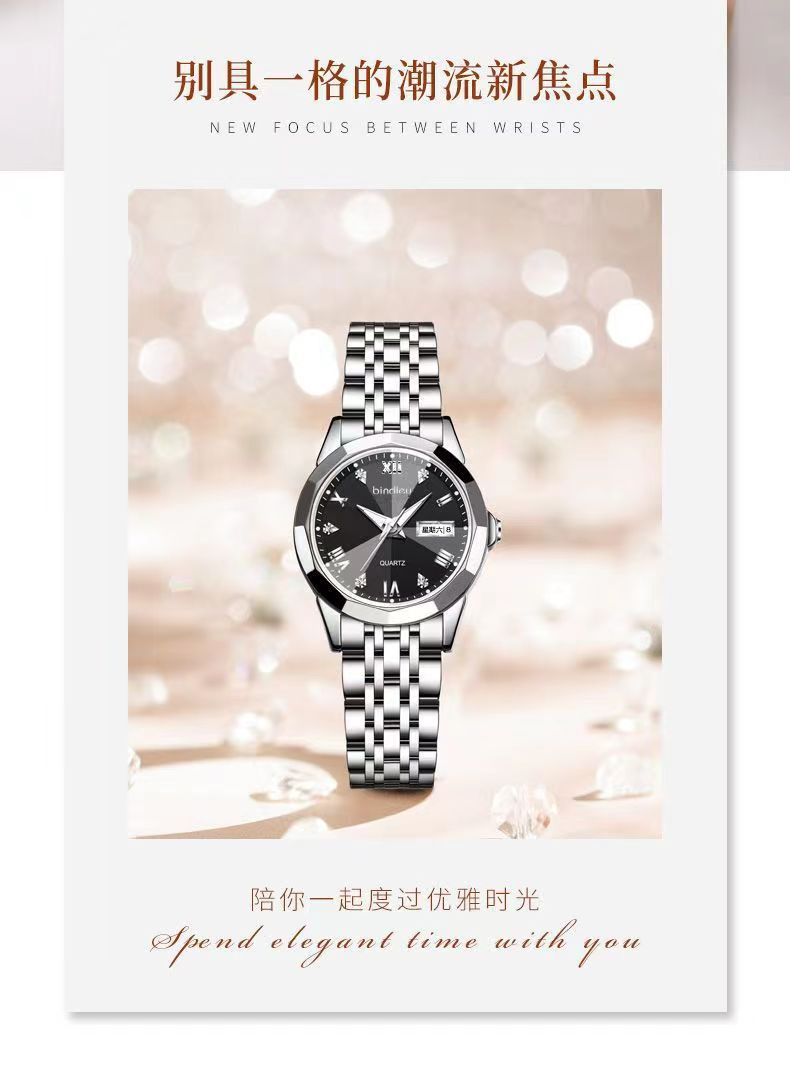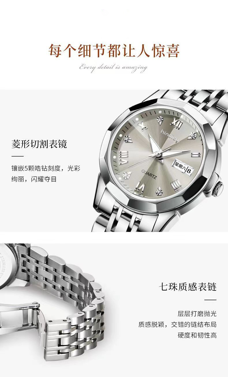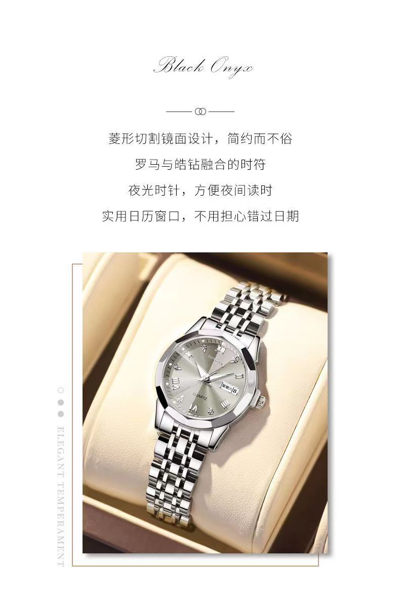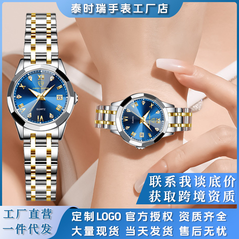 新款石英情侣表镶钻钢带防水日历时尚小众高级感腕表跨境爆款石英