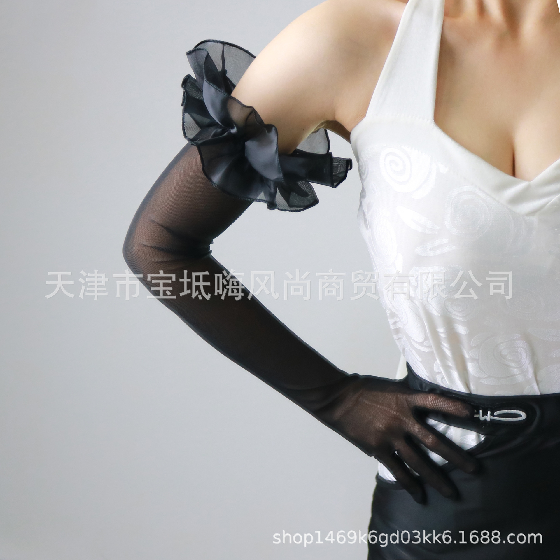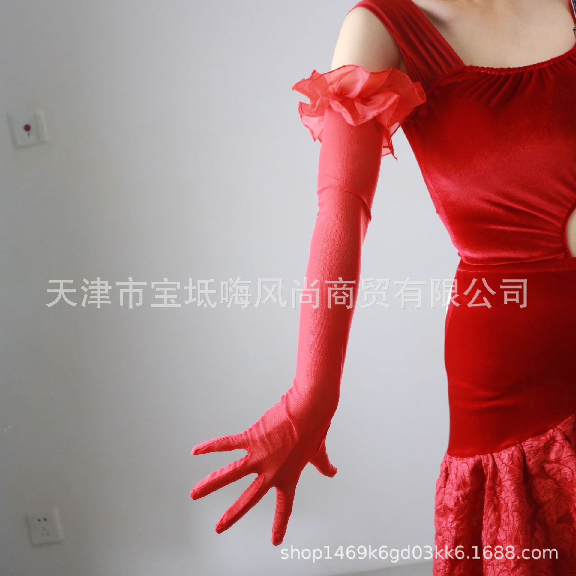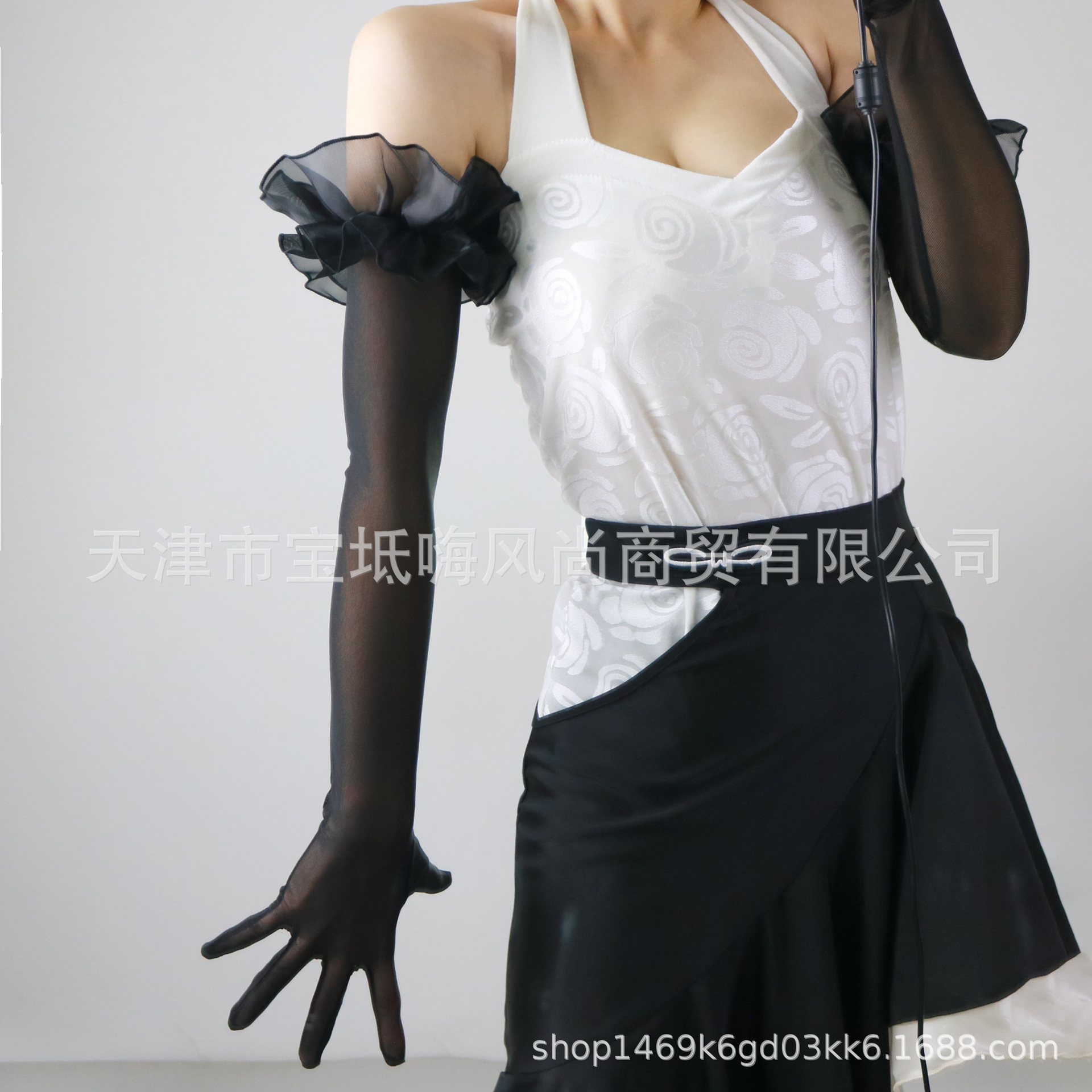 55cmストレッチメッシュ手袋パールレース袖カバーモードダンスラテン薄いレース透視セクシーモノクロ赤