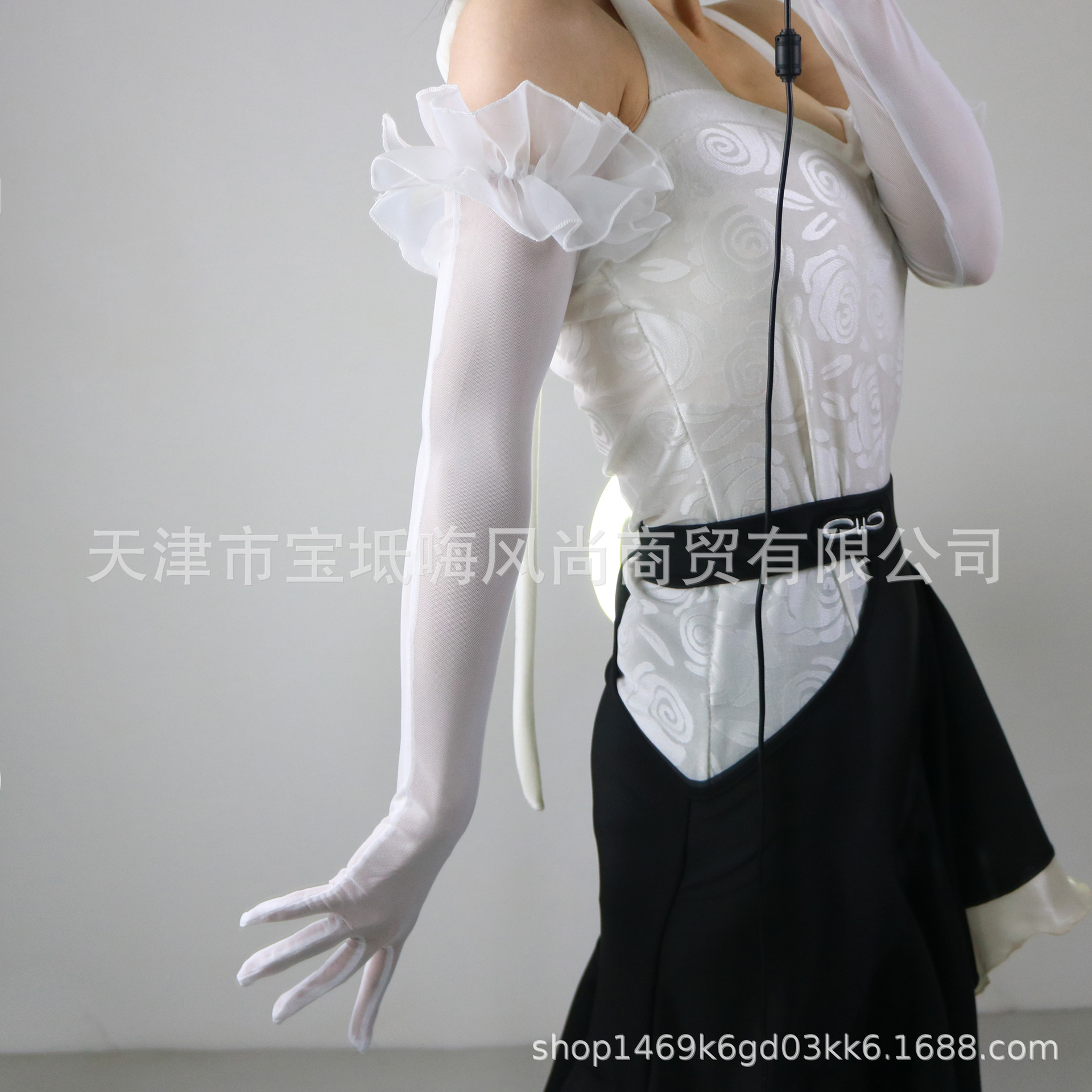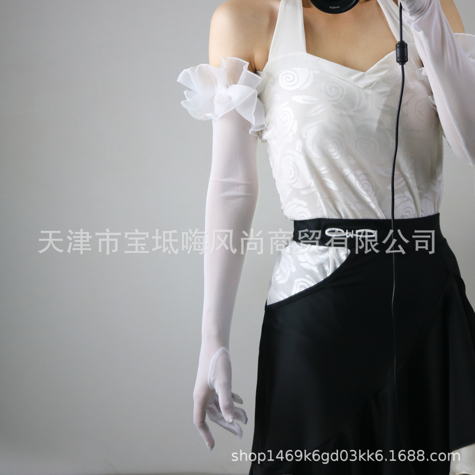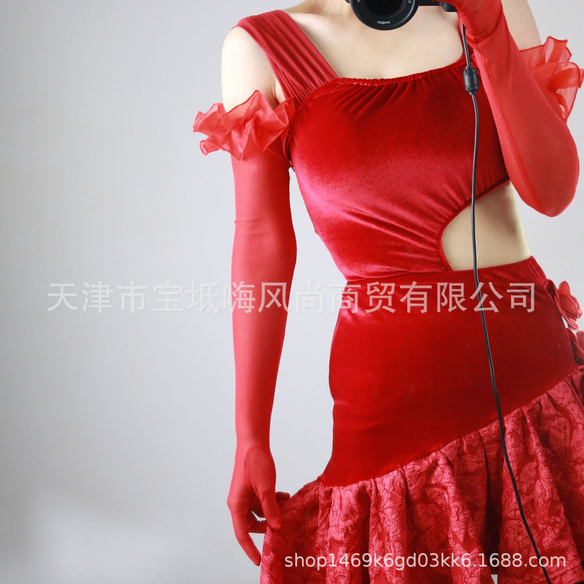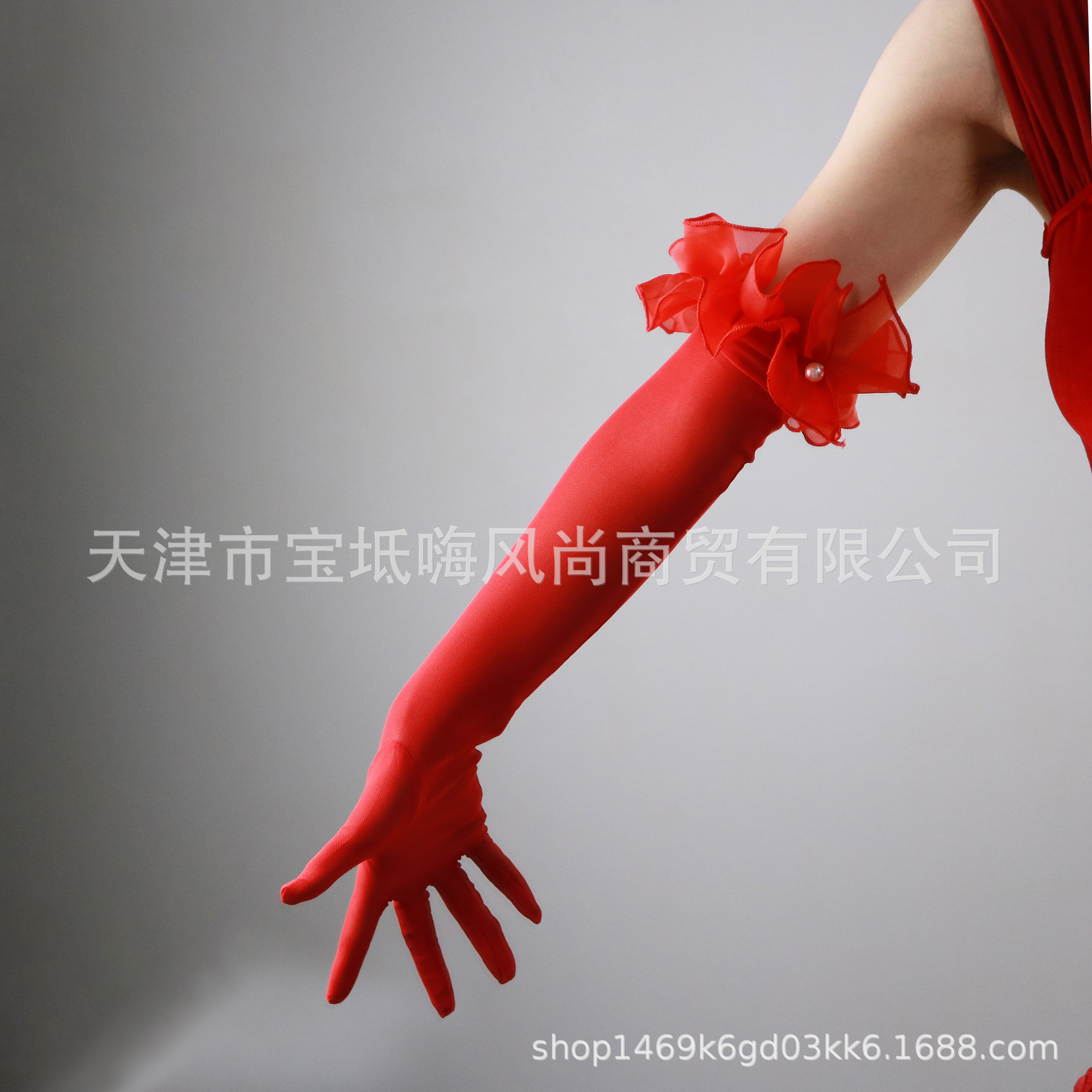 55cmストレッチメッシュ手袋パールレース袖カバーモードダンスラテン薄いレース透視セクシーモノクロ赤