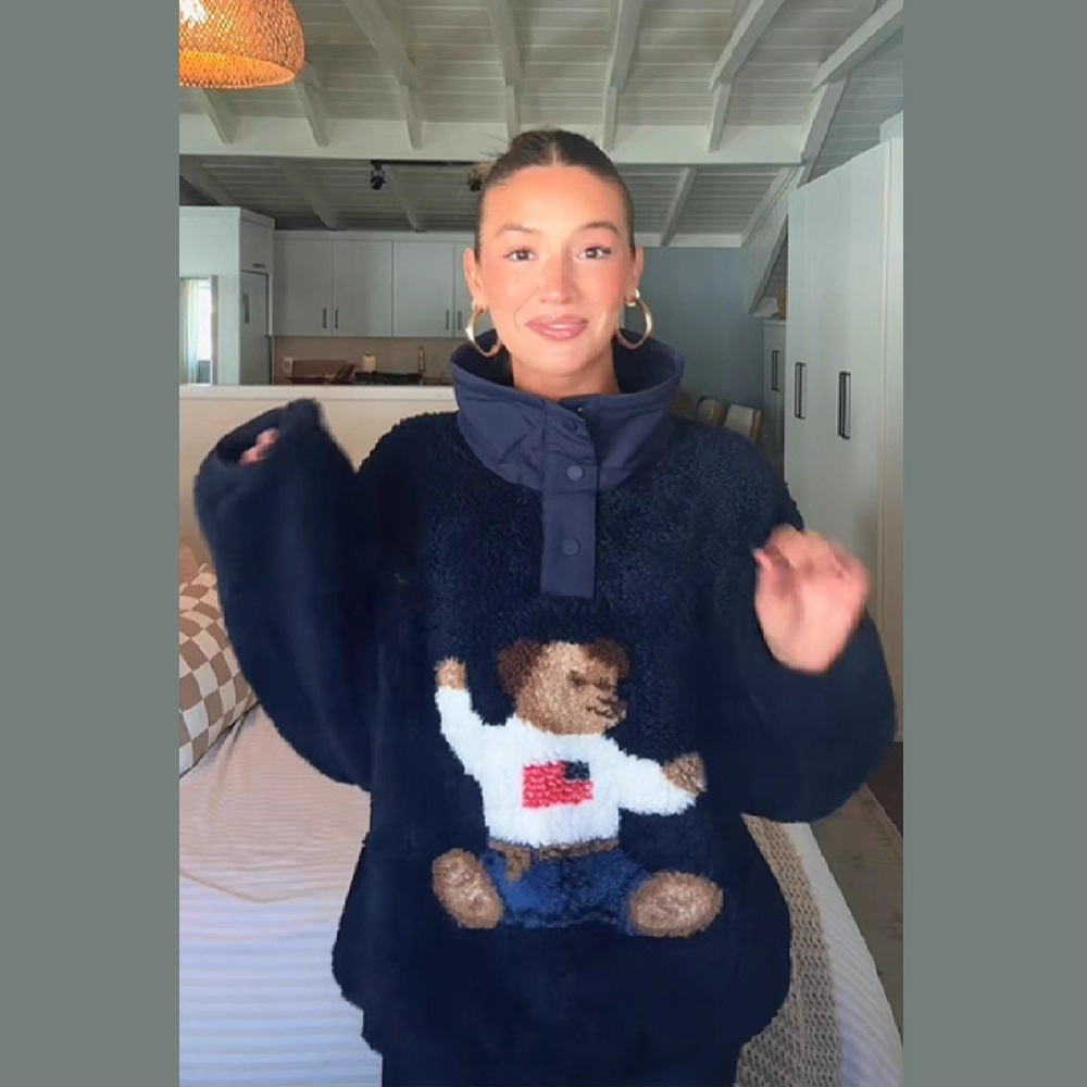 越境ECサイトで人気のレディースファッション 2025秋冬 ベア柄ペイント風 ゆったりスタイル プラッシュジャケット+リゾートビーチスカート