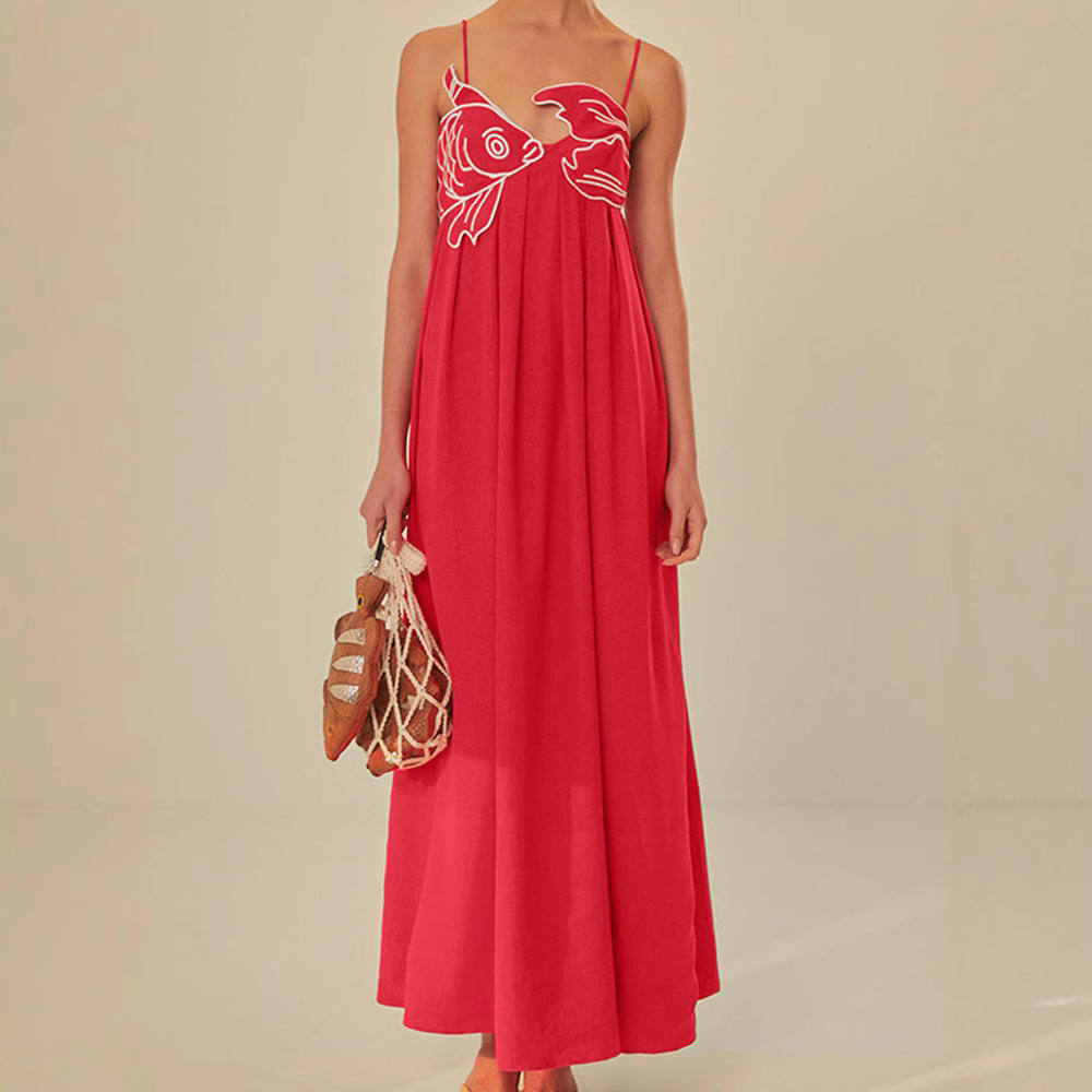 欧米風婦人服、甘いスタイルの刺繍入りキャミワンピース、金魚柄、シングルショルダーストラップ、ゆったりシルエットのロングワンピース、ハイウエストゆったりロングワンピース