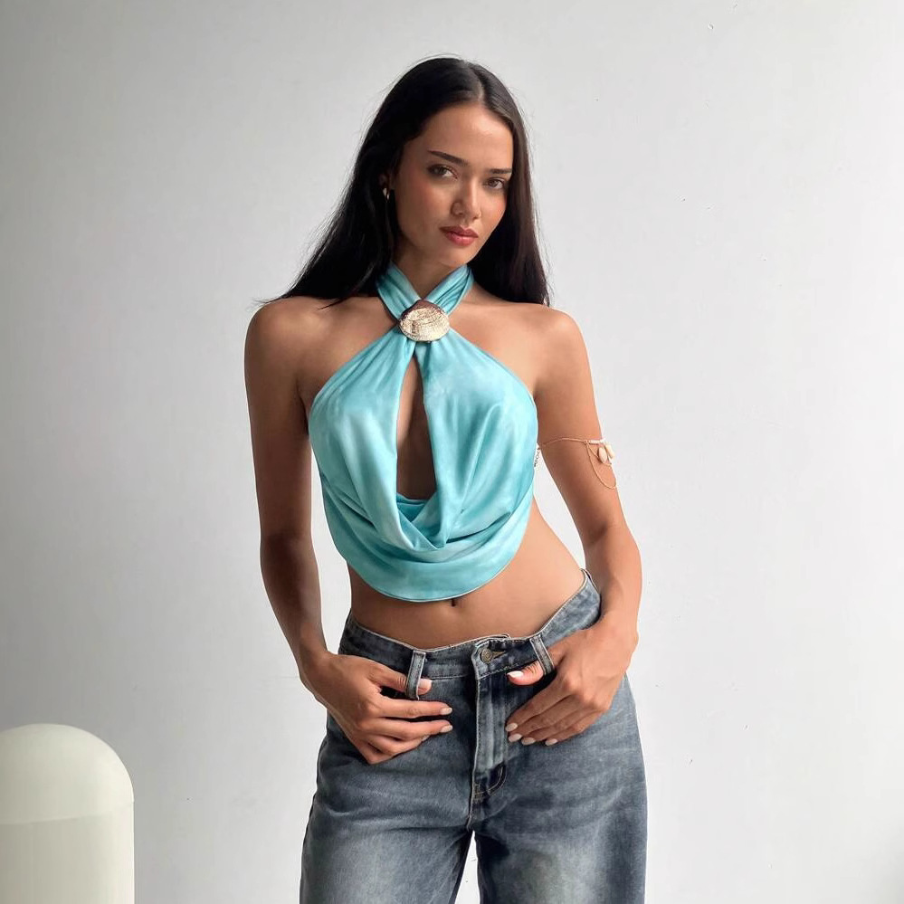 スポット 2025 新しい夏のセクシーな湯たんぽレースアップビーチ休暇背中の開いたシェル装飾ホルターネックホルタートップ