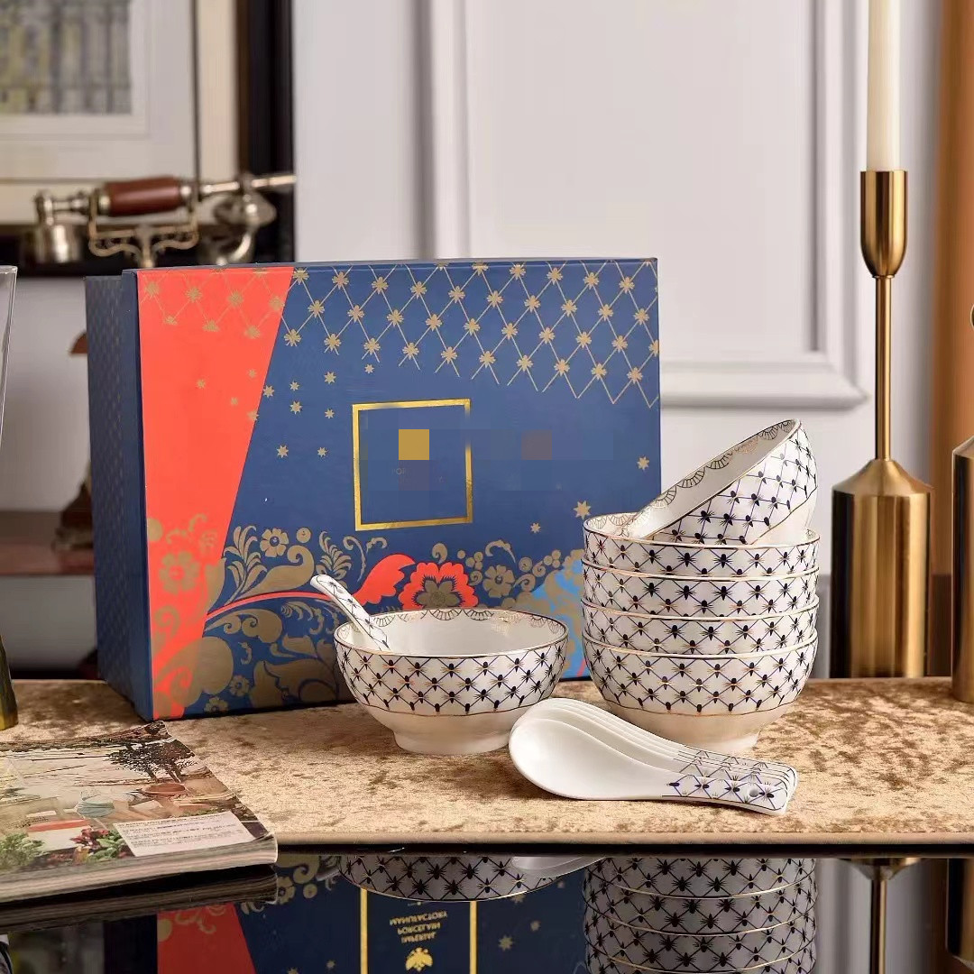 ロシア磁器コバルトブルーメッシュディナーボウルライスボウル家庭用ライト高級食事ボウル高価値組み合わせパッケージ卸売