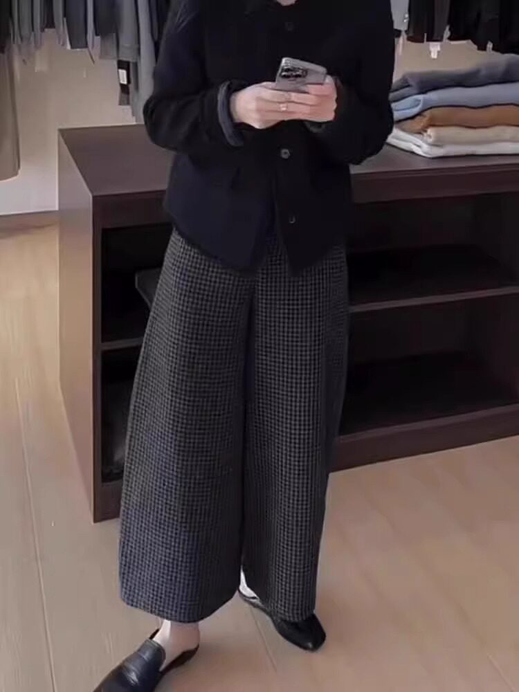 黑色复古格纹毛呢阔腿裤女2025年秋冬新款韩版加厚宽松显瘦九分裤