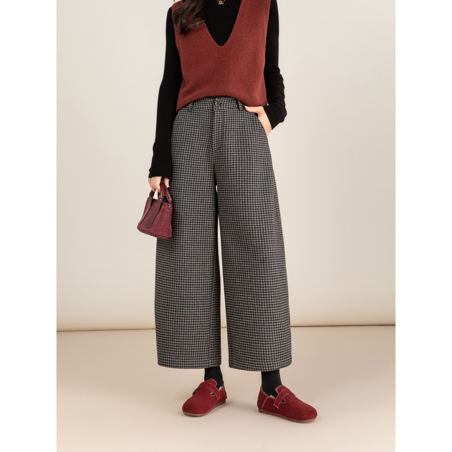 加绒加厚千鸟格羊毛呢高腰阔腿裤女2025秋冬新款垂感时尚九分裤子