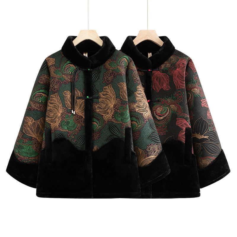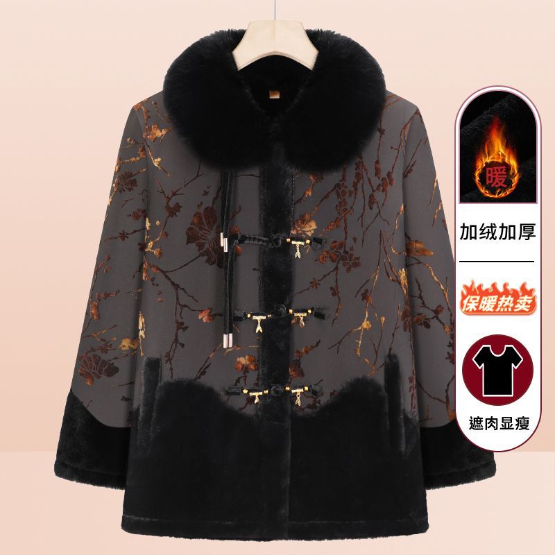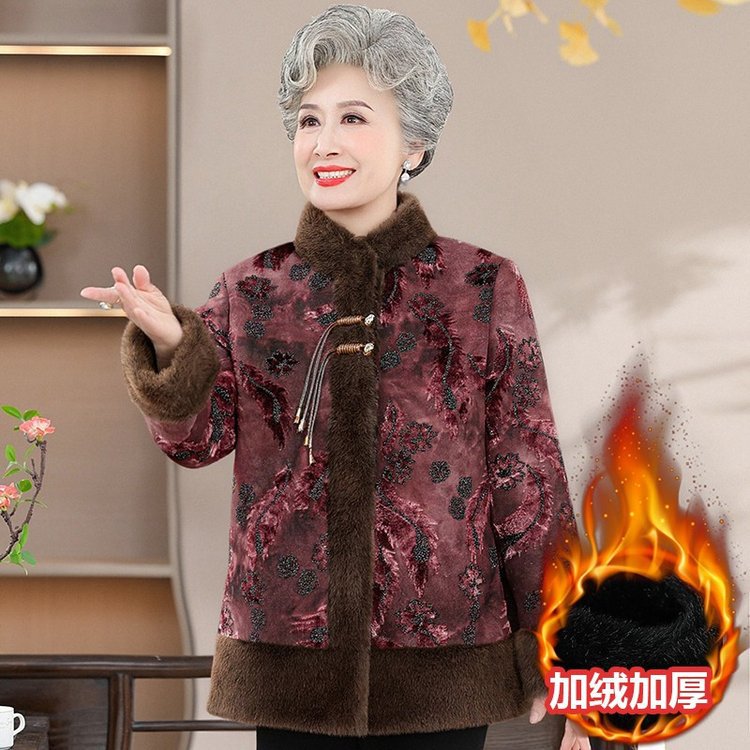 中高年の秋の服装の女性のおばあさんの上着の洋風のお母さんの秋冬の上着のおばあさんの唐はベルベットを詰めて服を厚くします。