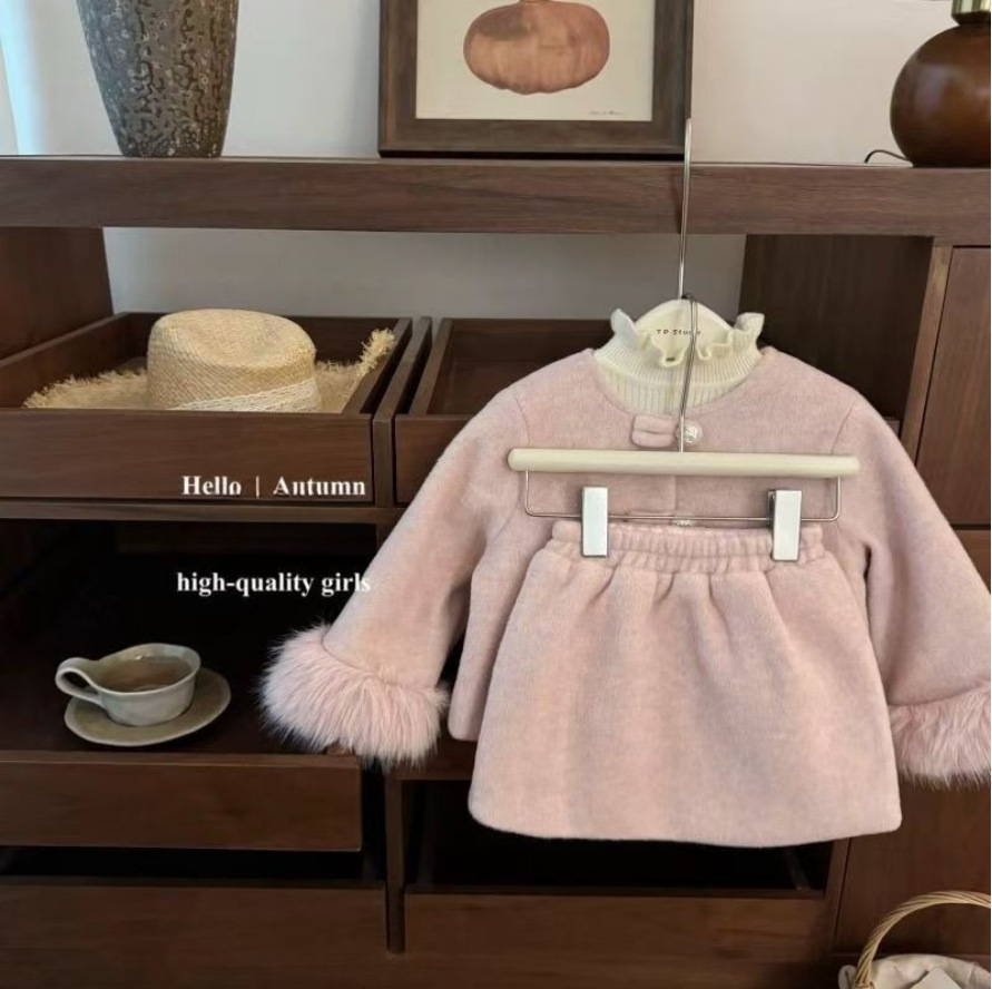 甜妹!秋冬女宝小香风毛毛袖口外套洋气加厚半裙套装