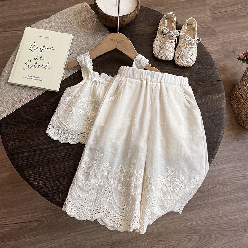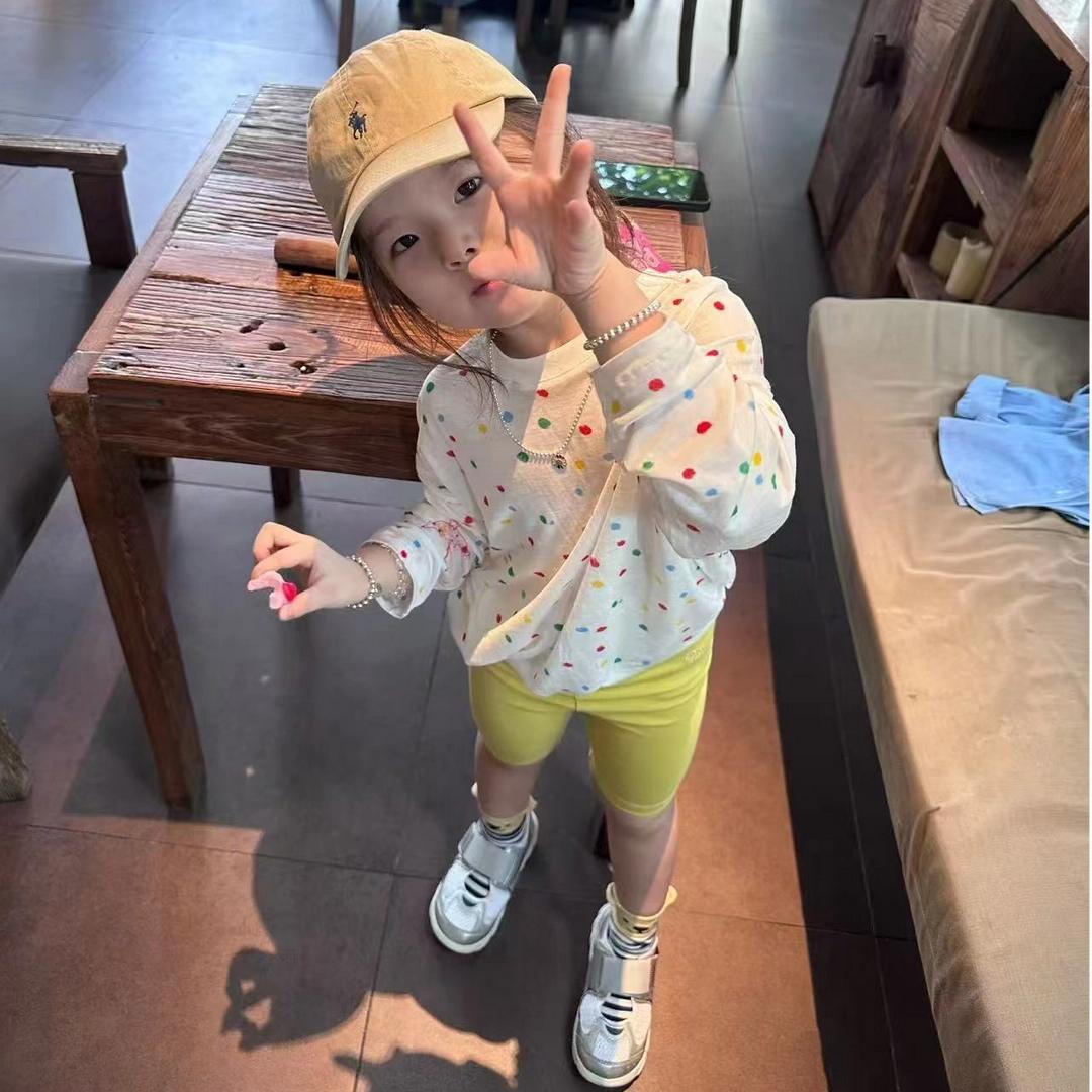 女の子スーツ 2025 夏カジュアル韓国風外国スタイル水玉文字プリントトップ無地サイクリングパンツ 2 点セット