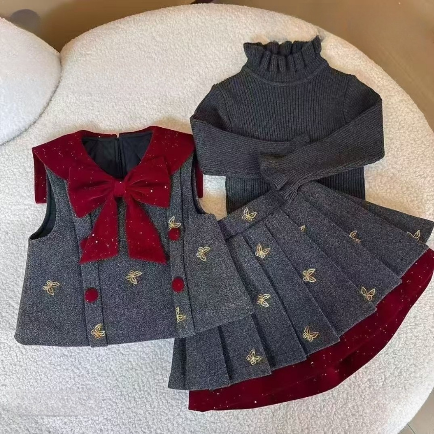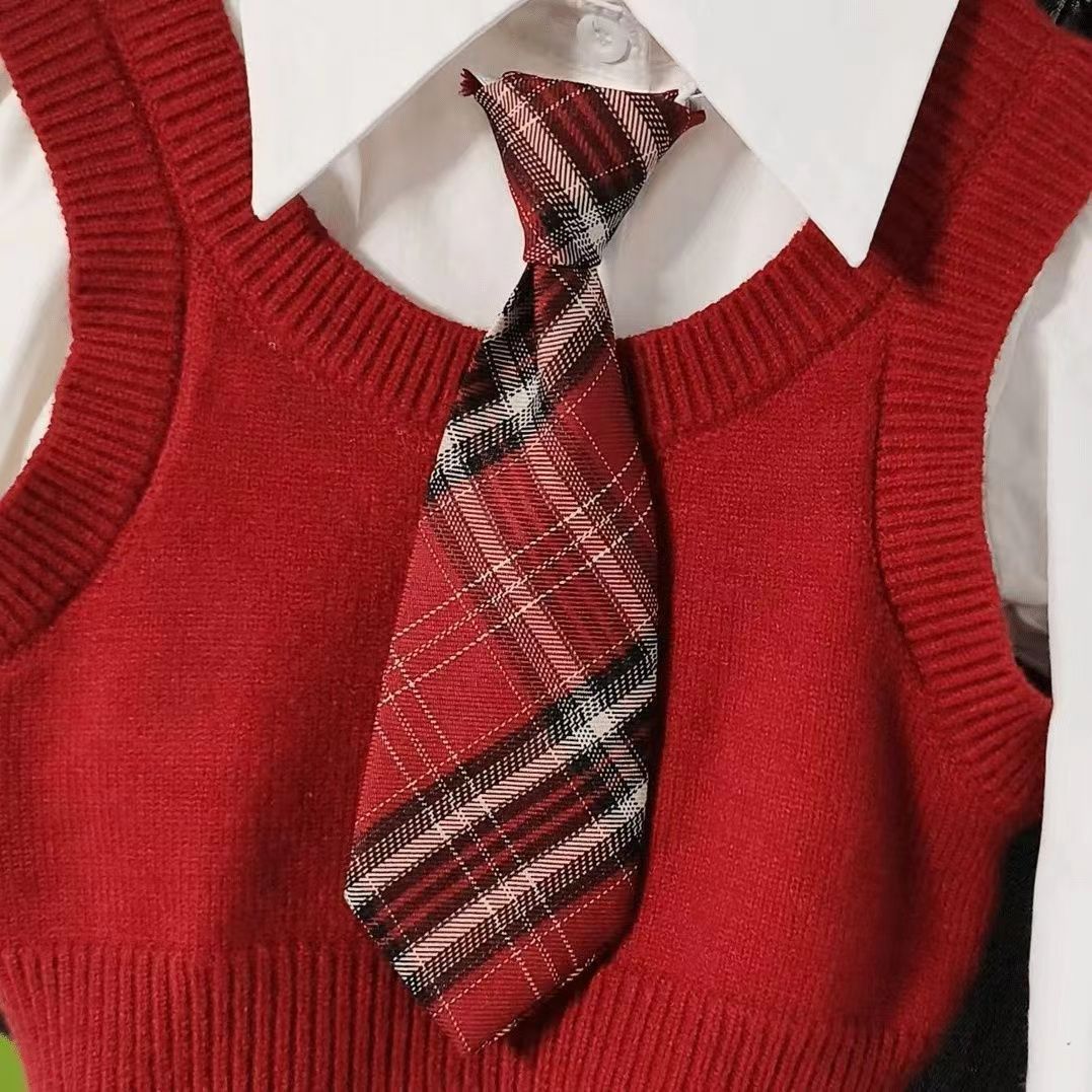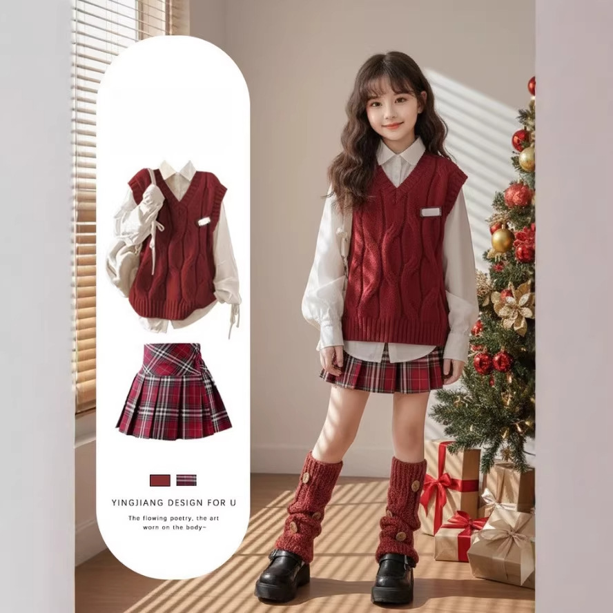 女童新年红色马甲学院风针织毛衣26冬季中大童初中生三件时尚套装