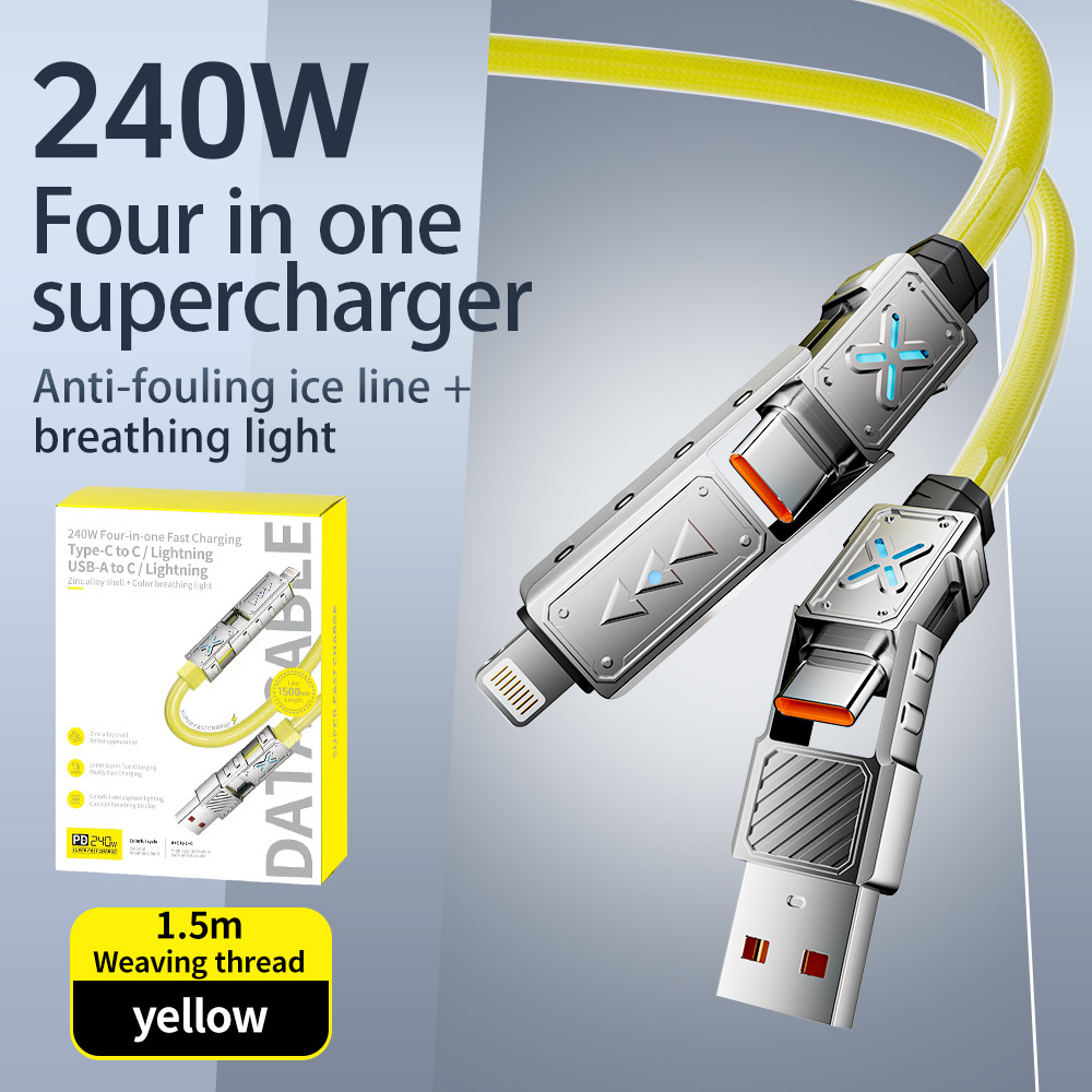 【安全急速充電】240W倍速超高速充電 亜鉛合金インターフェース カラフル呼吸灯 4-in-1 データケーブル