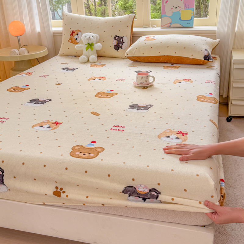 a类牛奶绒冬季床笠单件卡通毛巾绣加绒床罩三件套床垫保护罩全包