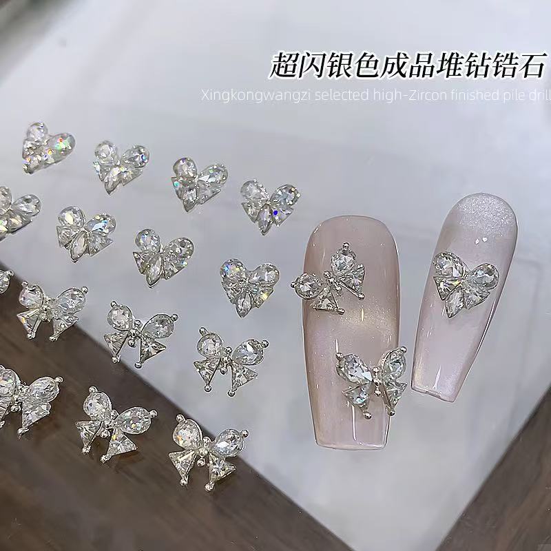 ネットの赤い新型の銀色の蝶ネクタイの爪のダイヤモンドの完成品の合金の蝶結びの積み重ねのドリルの超きらめきの爪の装飾品