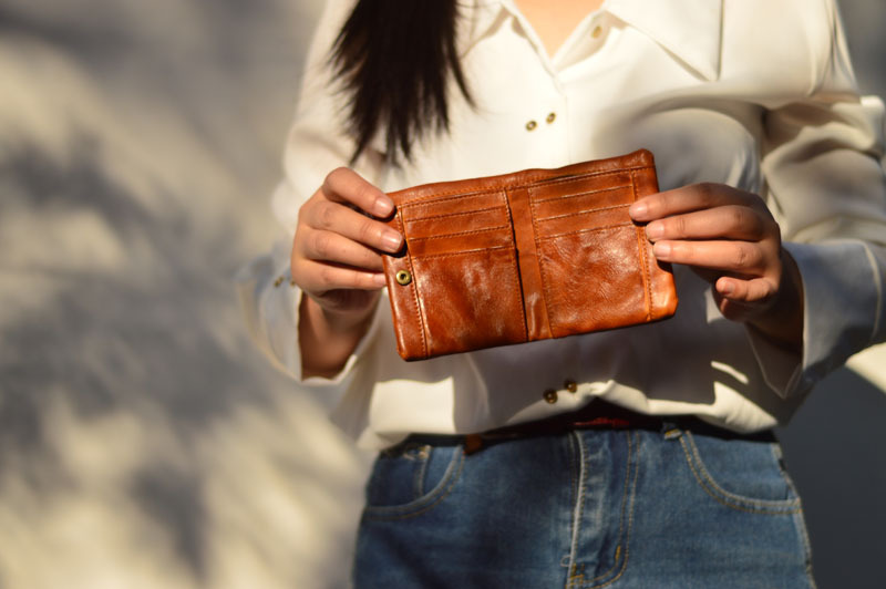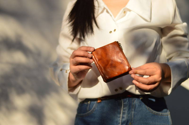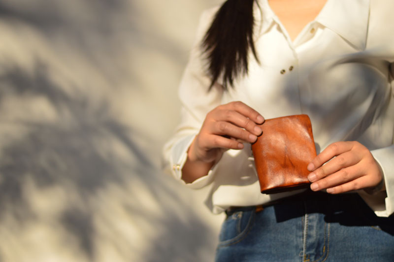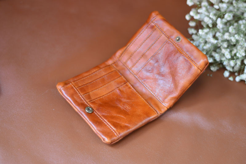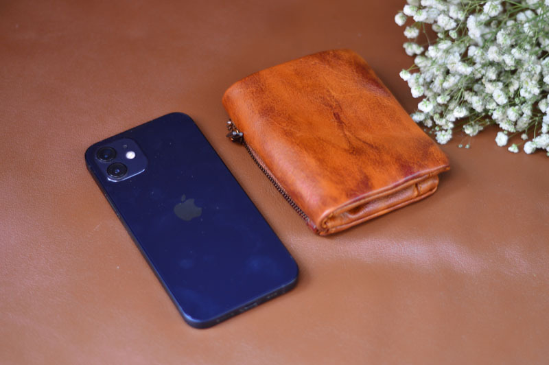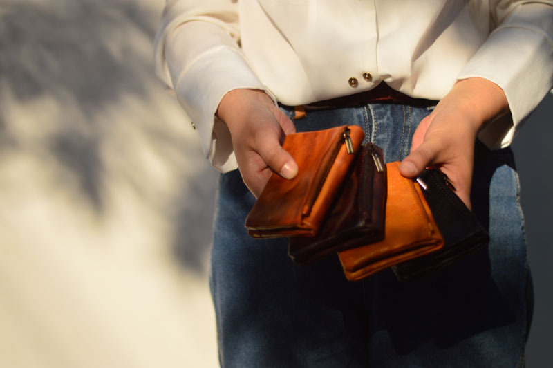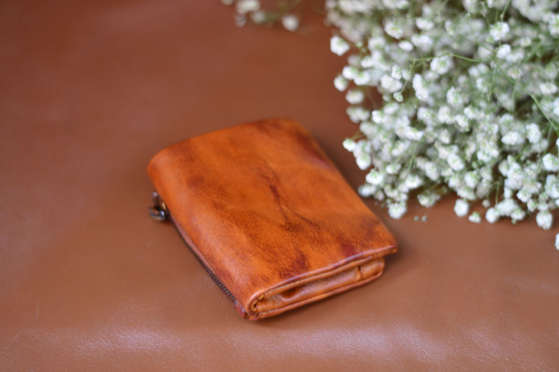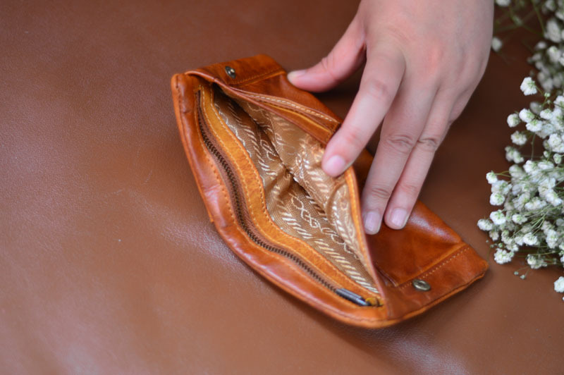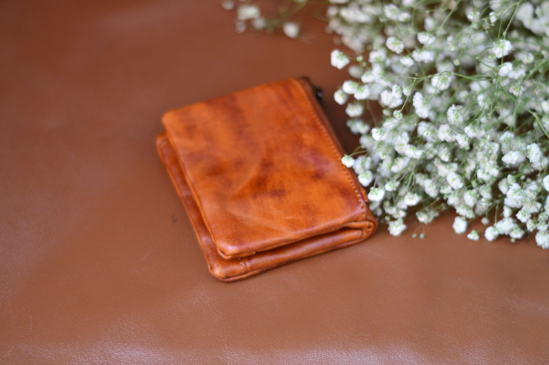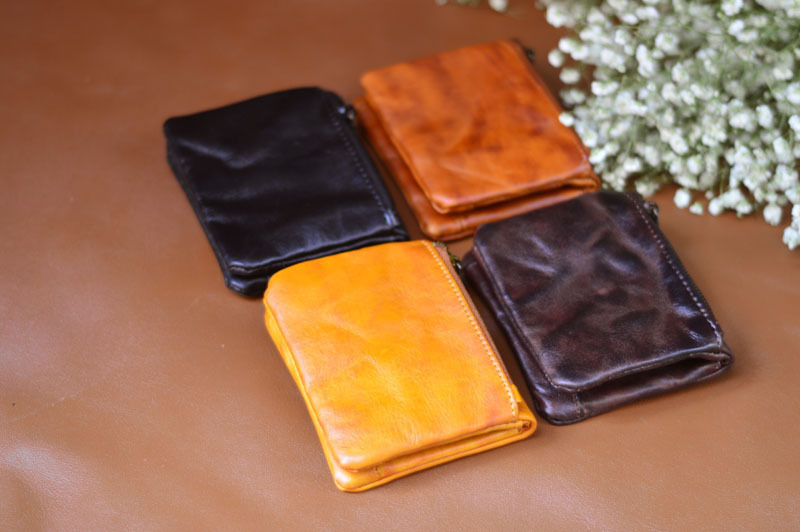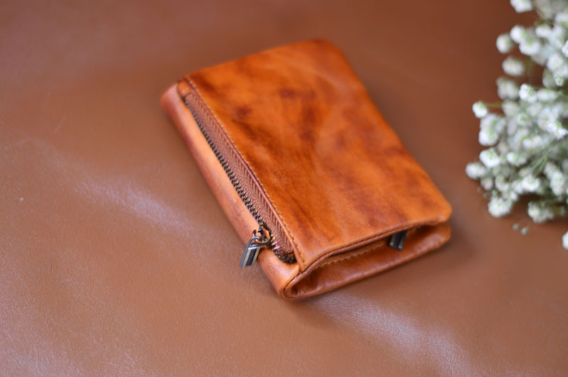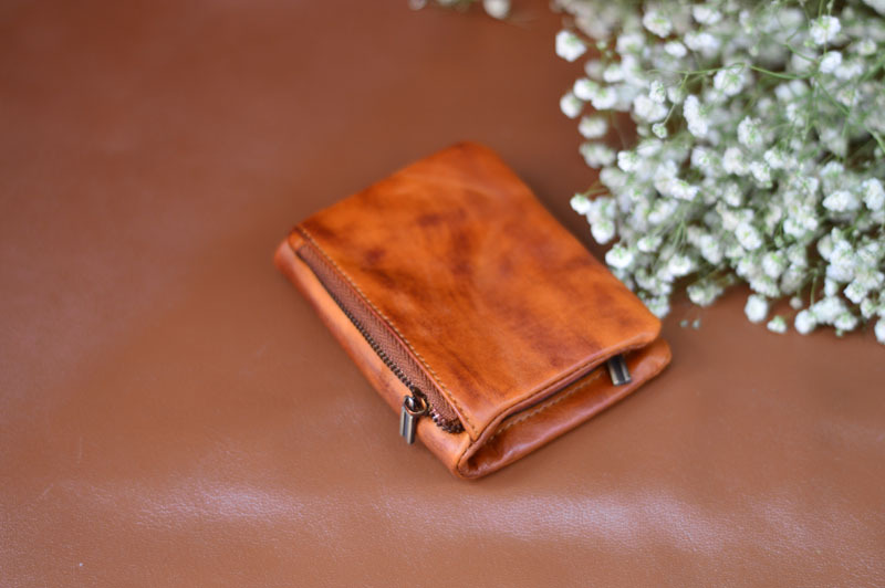 手作業で色を塗ってなめし革の牛革の財布をなめて復古します。