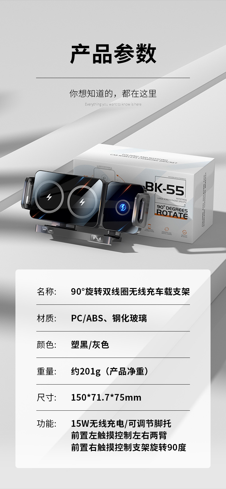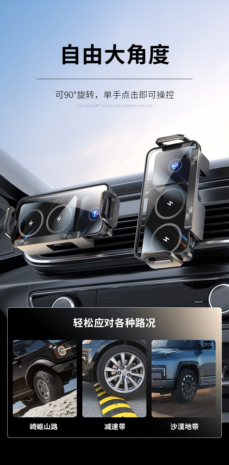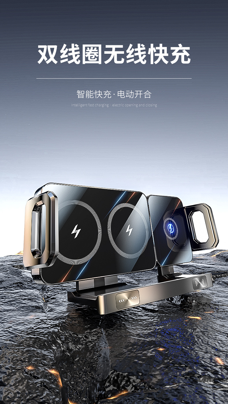 新しい折り畳み型車載携帯電話スタンドのデュアルワイヤレス充電は、より速く、より安定して、さまざまな携帯電話と90度回転できる