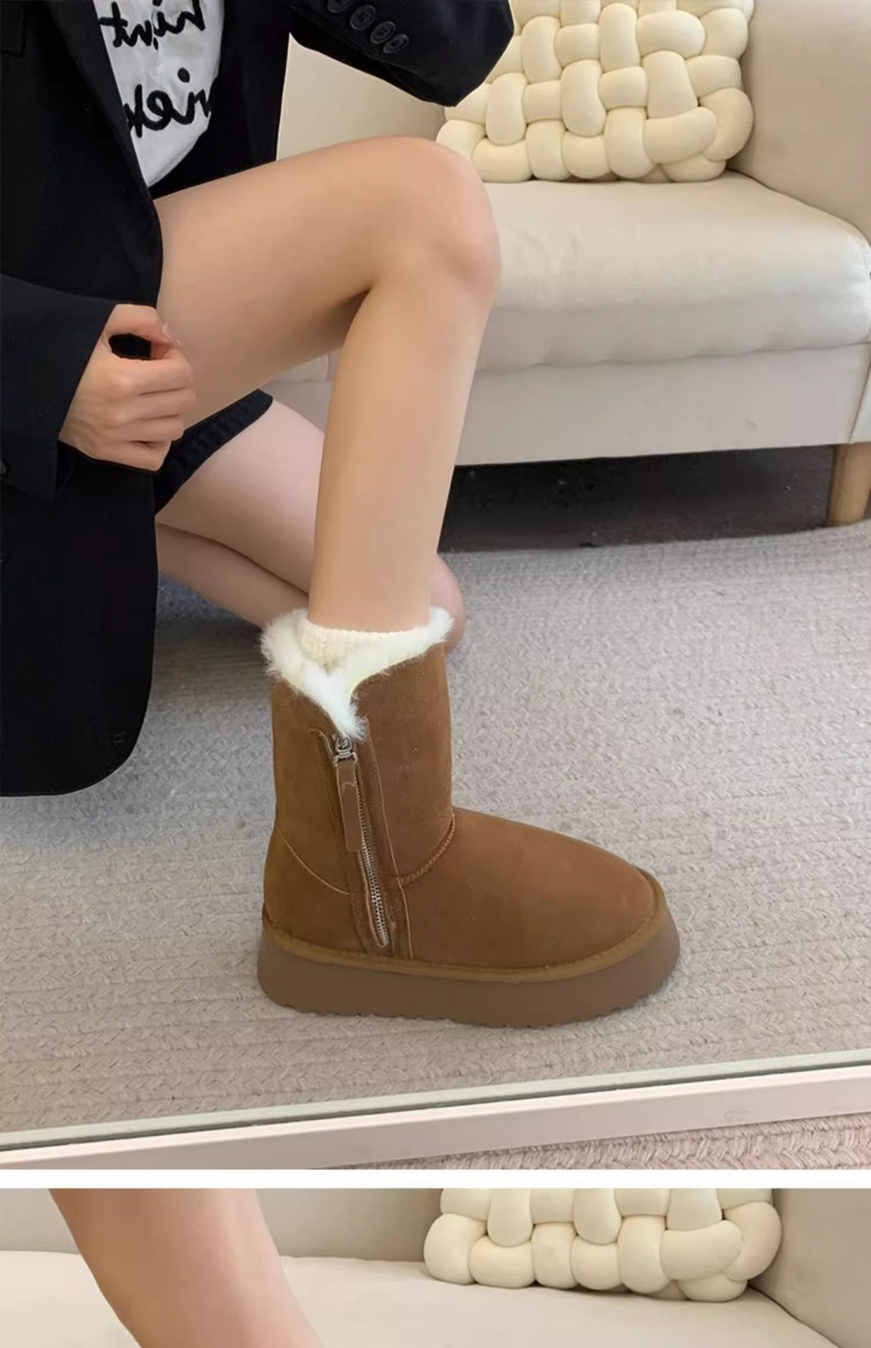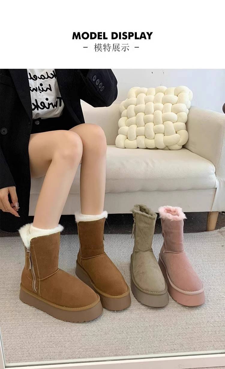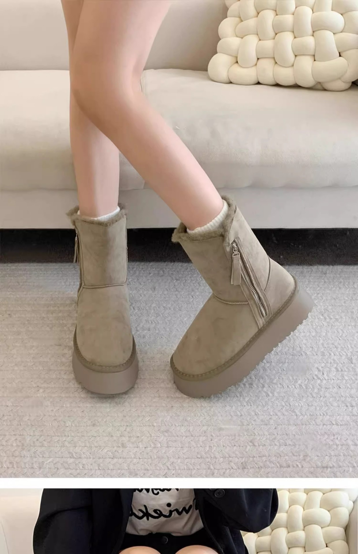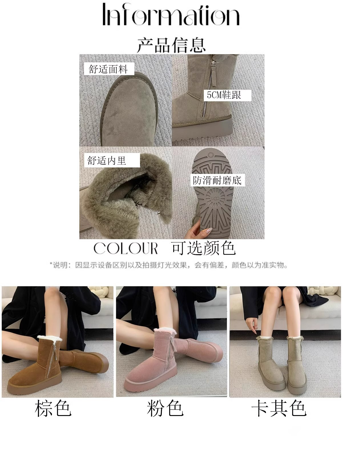 厚底スエード暖かいスノーブーツ防水多用途ミッドカーフブーツ2024冬サイドジッパーブーツ女性用綿靴冬モデル
