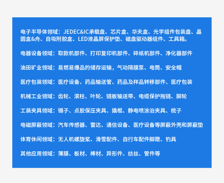 特性レベル 導電性帯電防止、軽量、高モジュール、高温耐性、耐食性など。