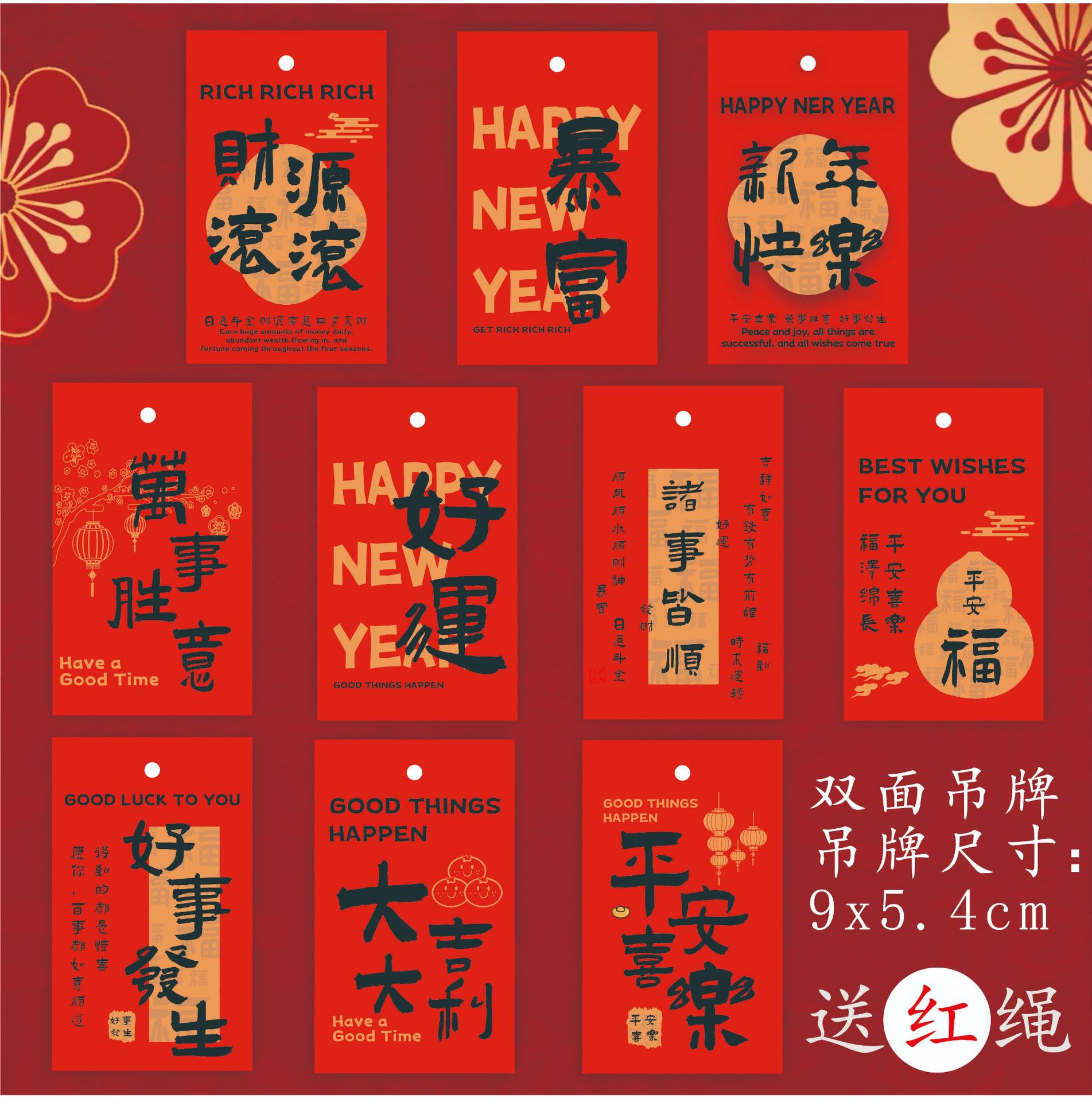 双面红色喜庆吊牌平安喜乐鲜花花束装饰手写祝福语创意打孔吊牌卡