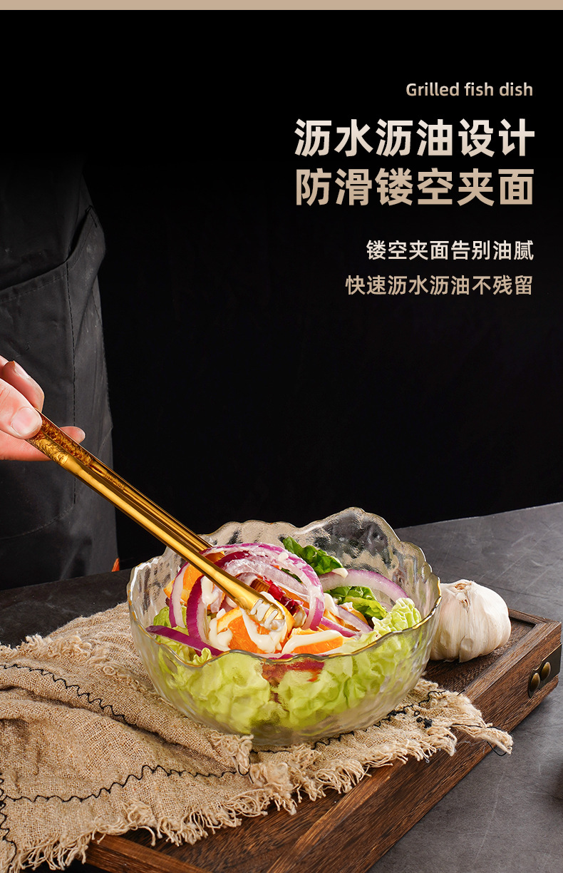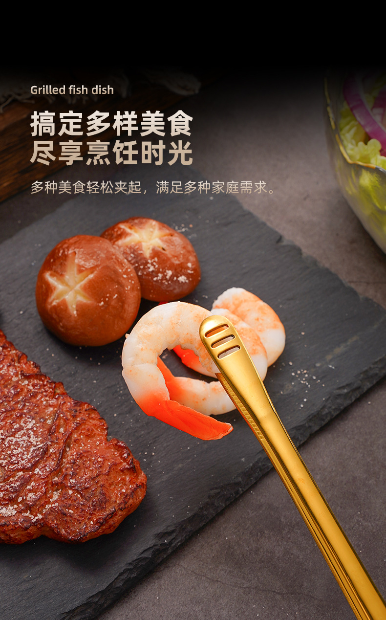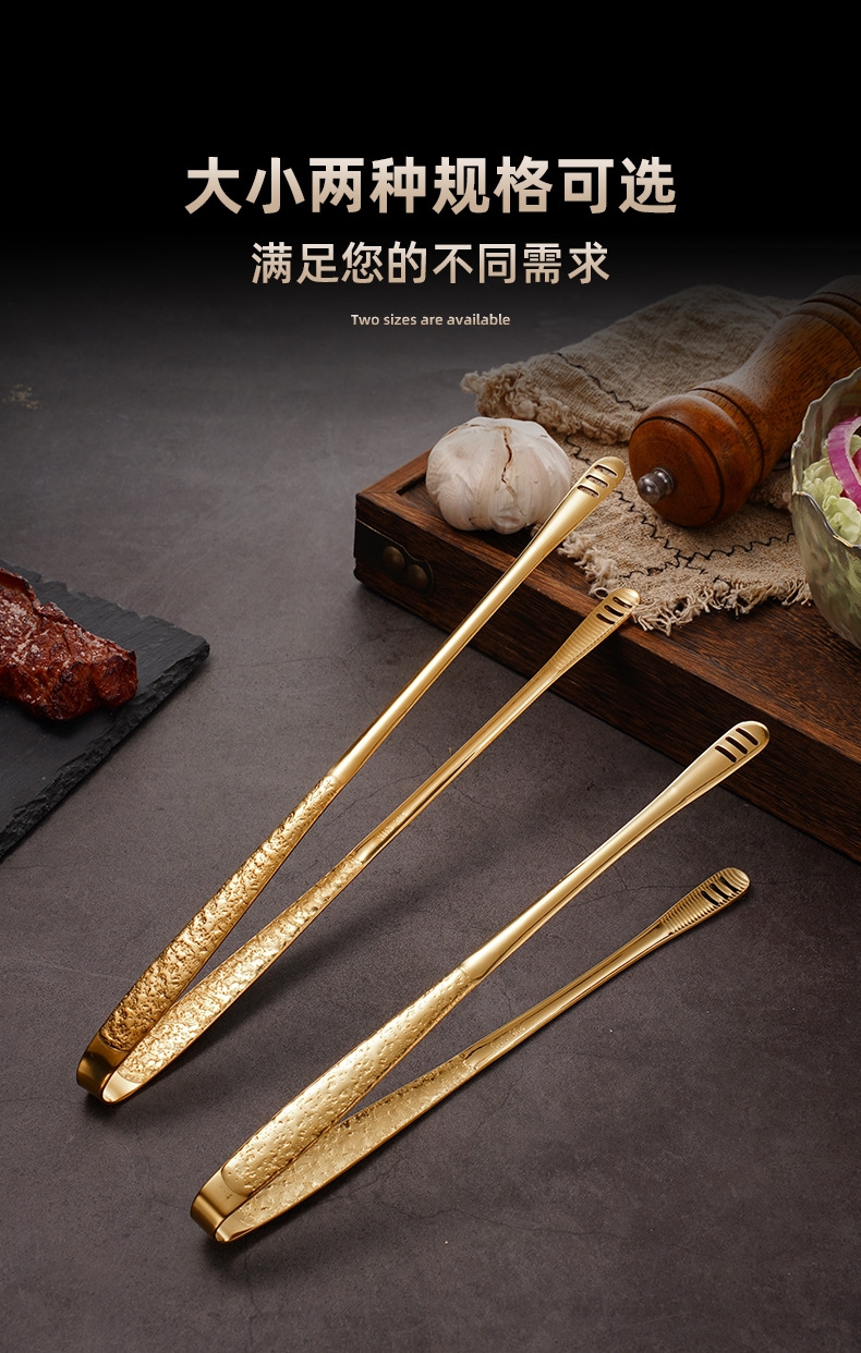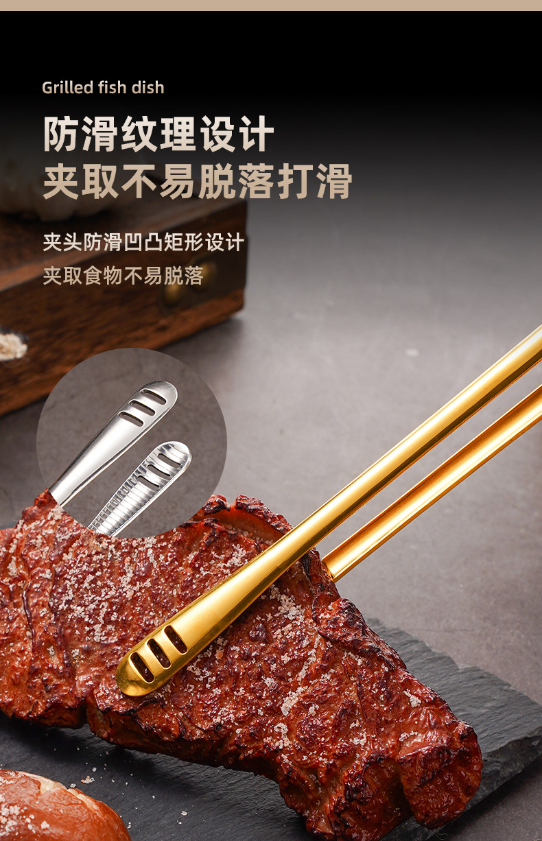 新しい304ステンレスのドリルの滑り止め焼肉の挟みは金色のステーキのバイキングの韓国式パンの食品の挟みを延長します。